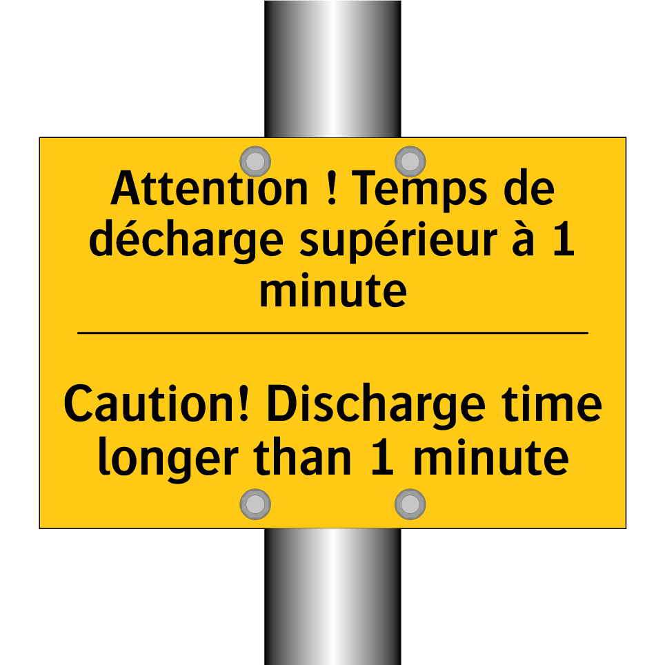 Panneau d'avertissement bilingue avec texte en français : "Attention ! Temps de décharge supérieur à 1 minute", et en anglais : "Caution! Discharge time longer than 1 minute"