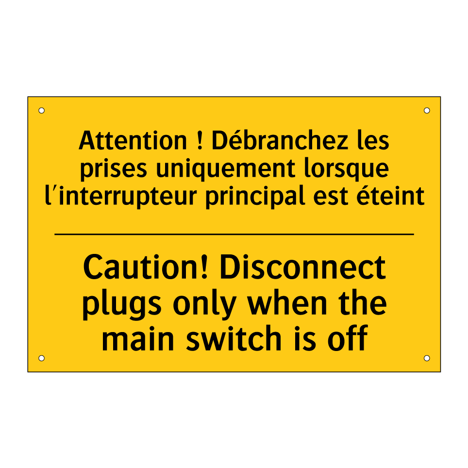 Panneau d'avertissement bilingue avec texte en français : "Attention ! Débranchez les prises uniquement lorsque l'interrupteur principal est éteint", et en anglais : "Caution! Disconnect plugs only when the main switch is off"