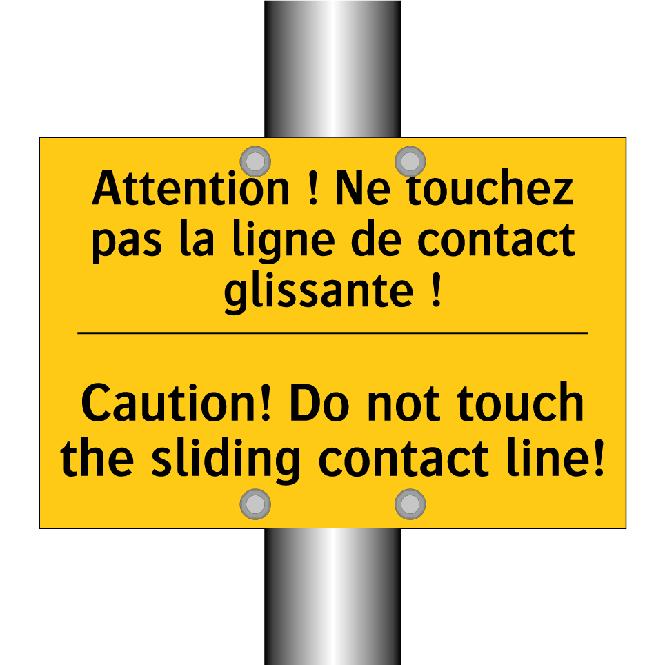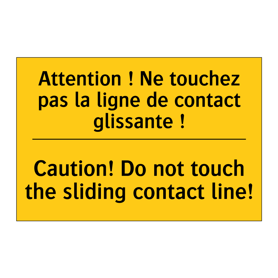 Panneau d'avertissement bilingue avec texte en français : "Attention ! Ne touchez pas la ligne de contact glissante !", et en anglais : "Caution! Do not touch the sliding contact line!"