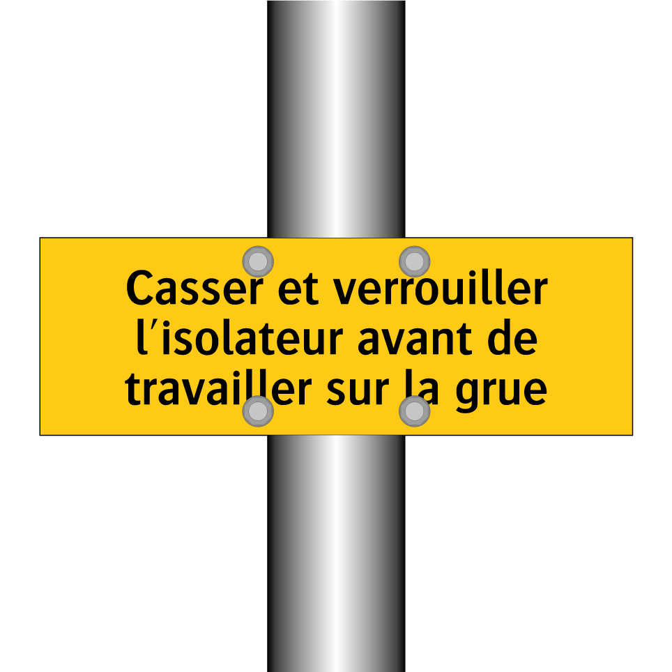 Panneau d'avertissement avec le texte : "Casser et verrouiller l'isolateur avant de travailler sur la grue"