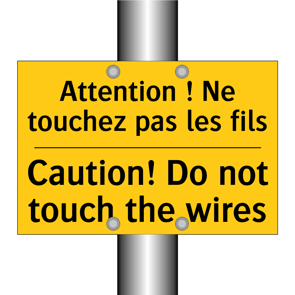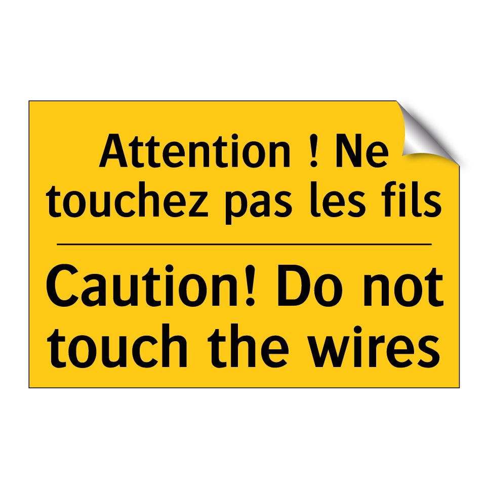 Panneau d'avertissement bilingue avec texte en français : "Attention ! Ne touchez pas les fils", et en anglais : "Caution! Do not touch the wires"
