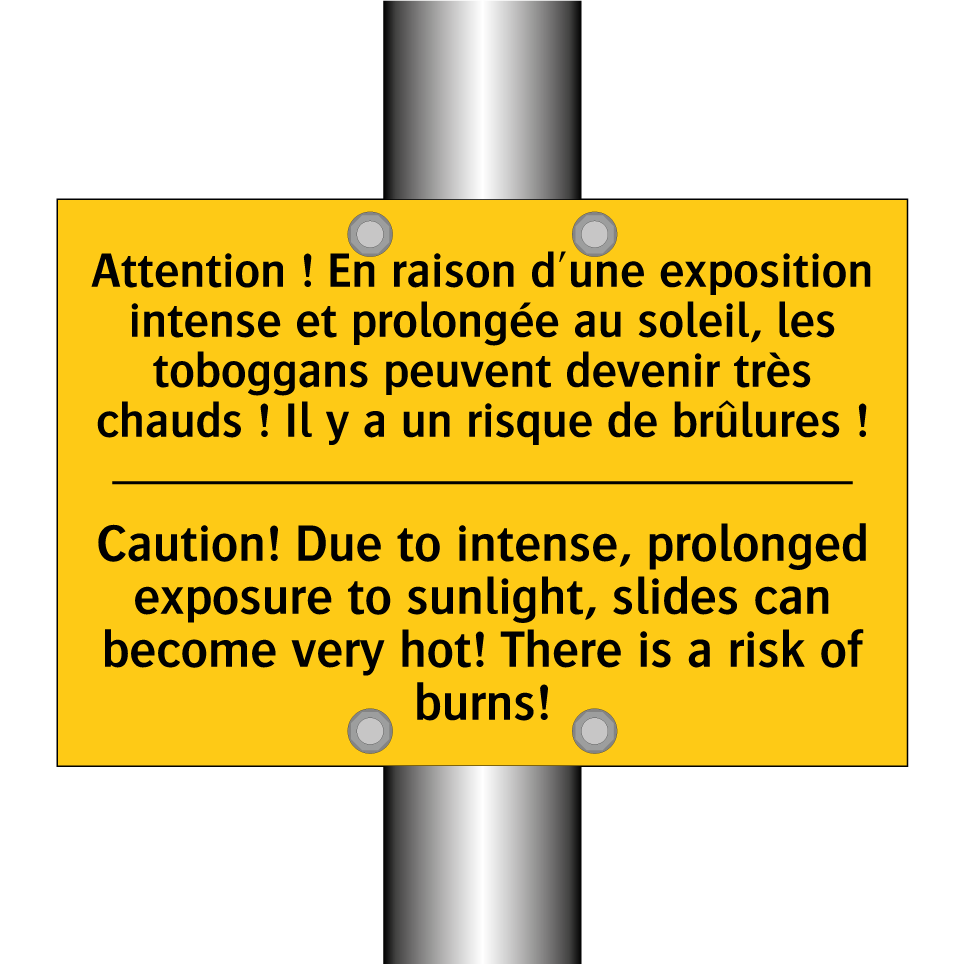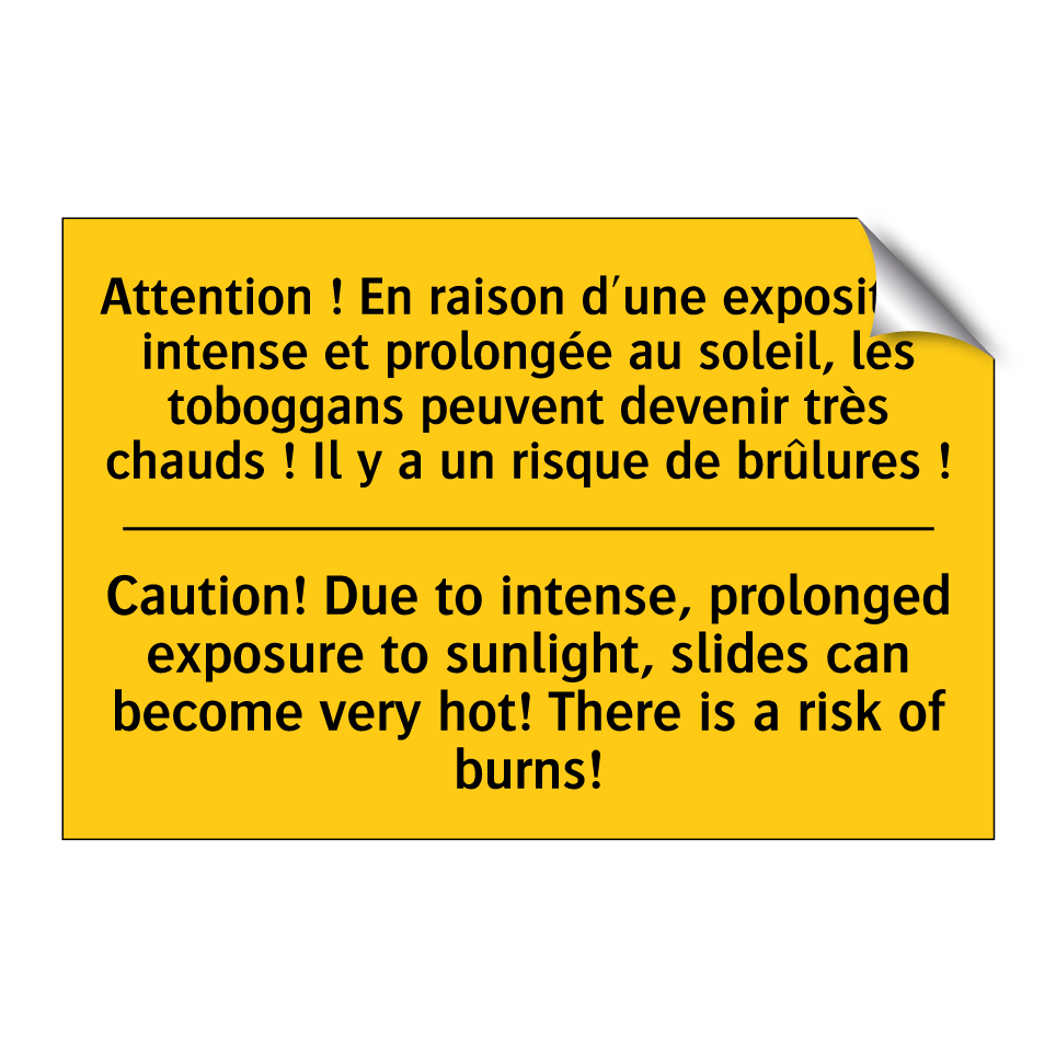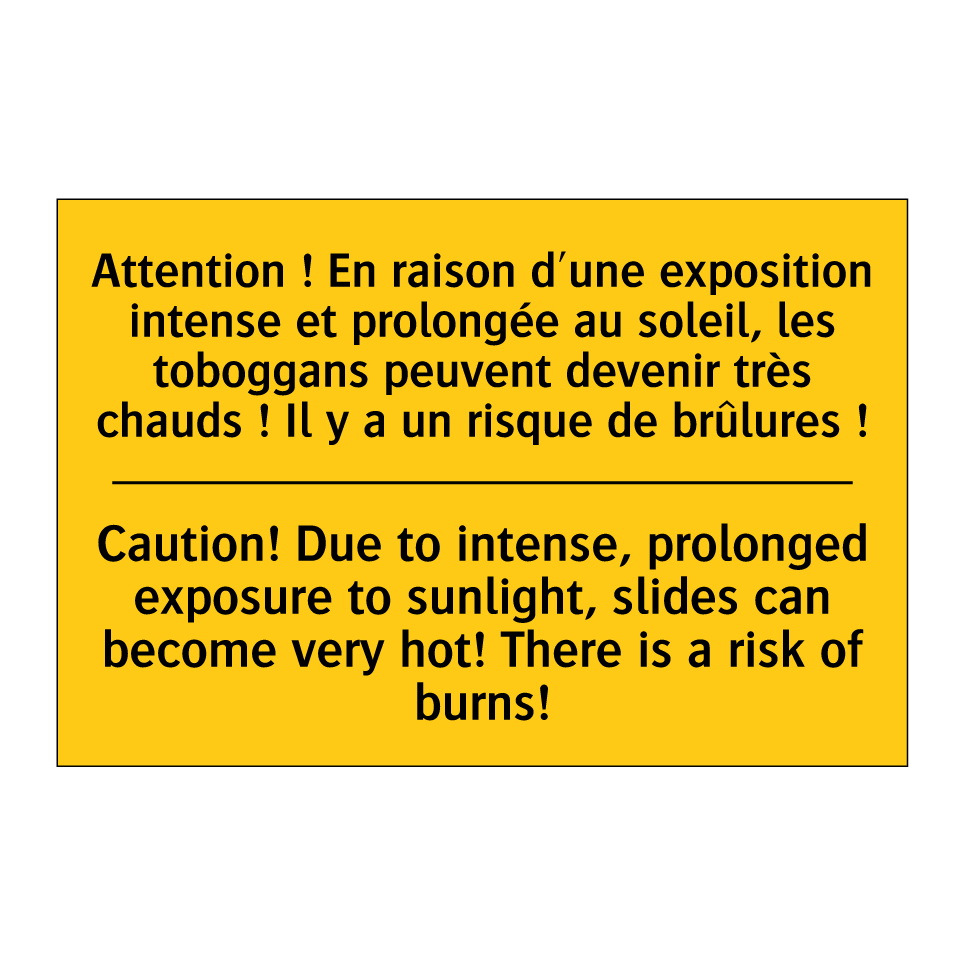 Panneau d'avertissement bilingue avec texte en français : "Attention ! En raison d'une exposition intense et prolongée au soleil, les toboggans peuvent devenir très chauds ! Il y a un risque de brûlures !", et en anglais : "Caution! Due to intense, prolonged exposure to sunlight, slides can become very hot! There is a risk of burns!"