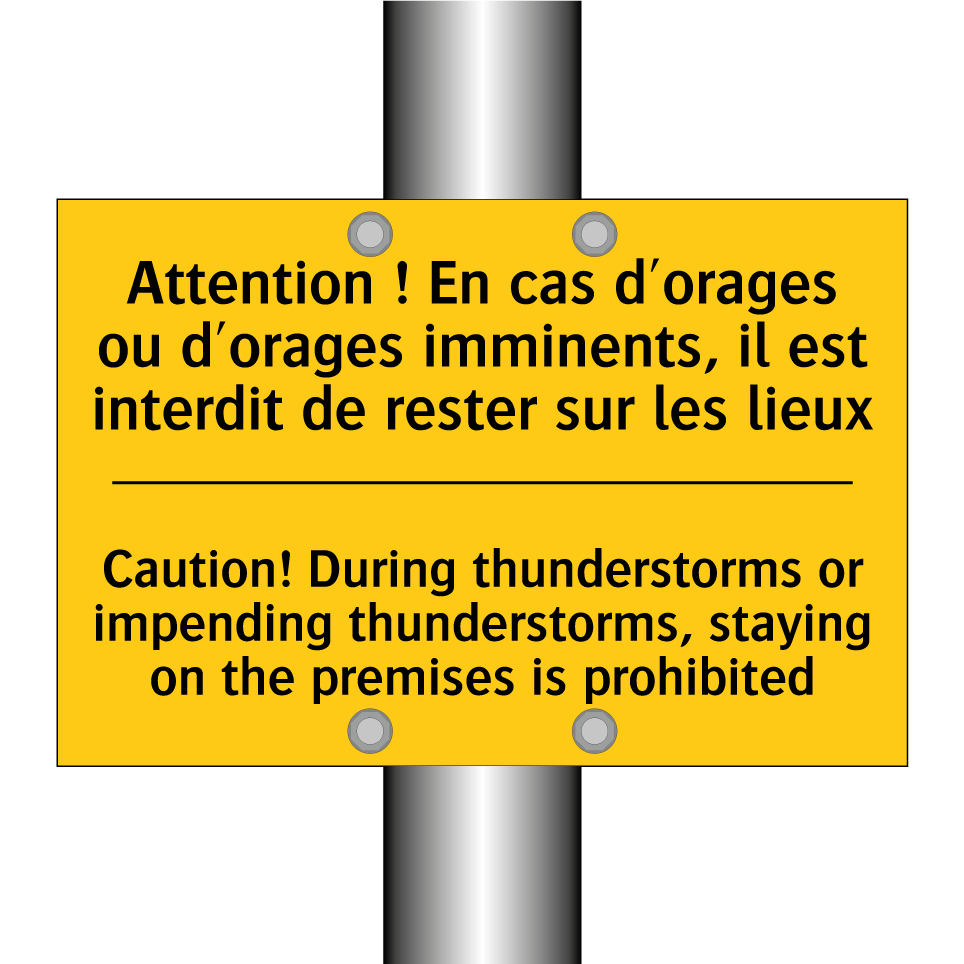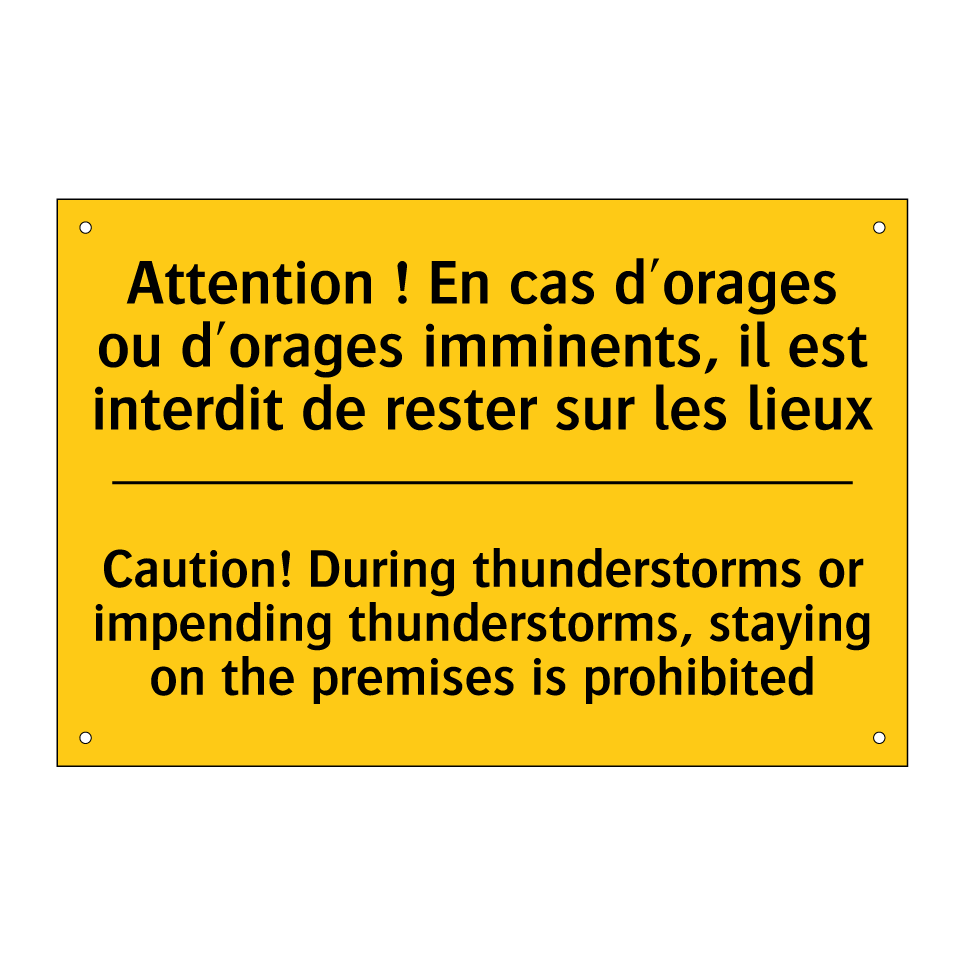 Panneau d'avertissement bilingue avec texte en français : "Attention ! En cas d'orages ou d'orages imminents, il est interdit de rester sur les lieux", et en anglais : "Caution! During thunderstorms or impending thunderstorms, staying on the premises is prohibited"