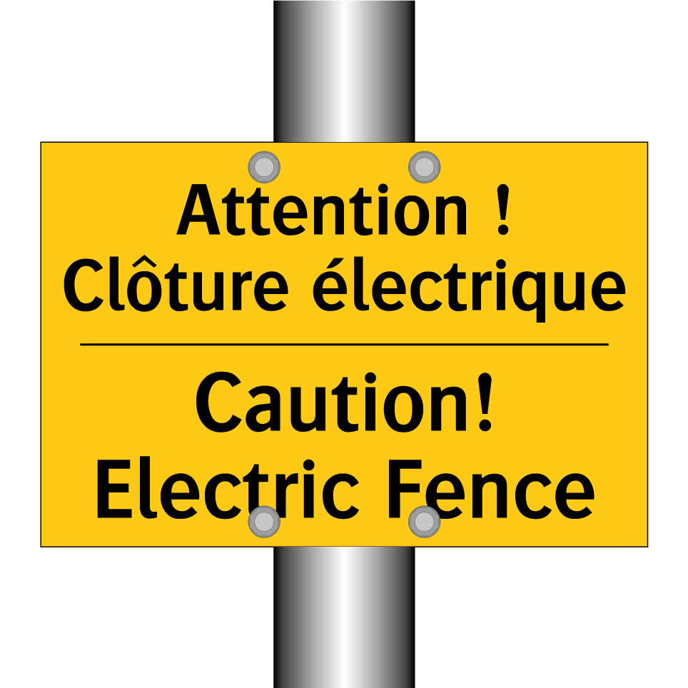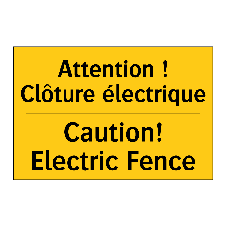 Panneau d'avertissement bilingue avec texte en français : "Attention ! Clôture électrique", et en anglais : "Caution! Electric Fence"