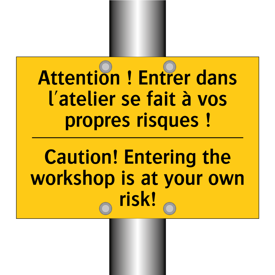 Panneau d'avertissement bilingue avec texte en français : "Attention ! Entrer dans l'atelier se fait à vos propres risques !", et en anglais : "Caution! Entering the workshop is at your own risk!"