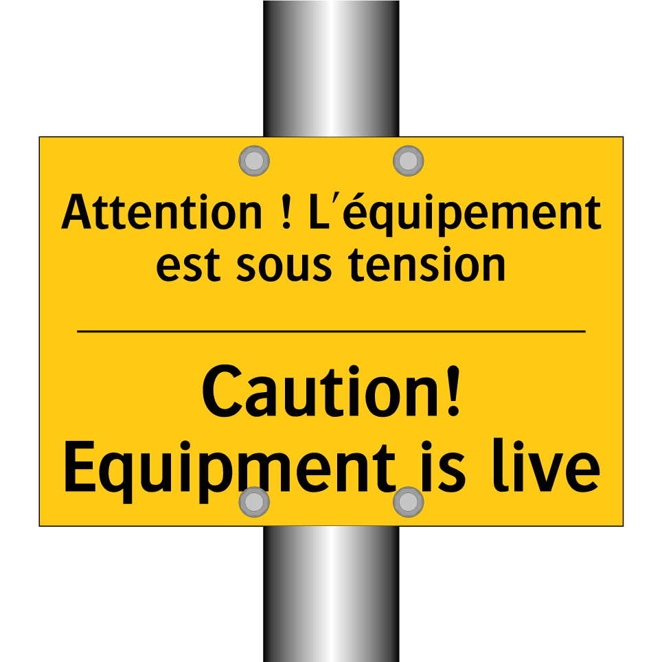 Panneau d'avertissement bilingue avec texte en français : "Attention ! L'équipement est sous tension", et en anglais : "Caution! Equipment is live"