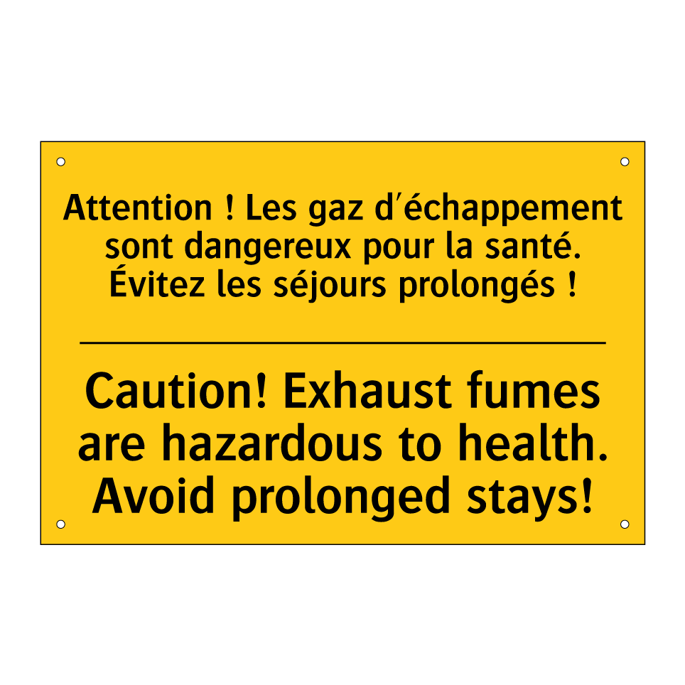 Panneau d'avertissement bilingue avec texte en français : "Attention ! Les gaz d'échappement sont dangereux pour la santé. Évitez les séjours prolongés !", et en anglais : "Caution! Exhaust fumes are hazardous to health. Avoid prolonged stays!"