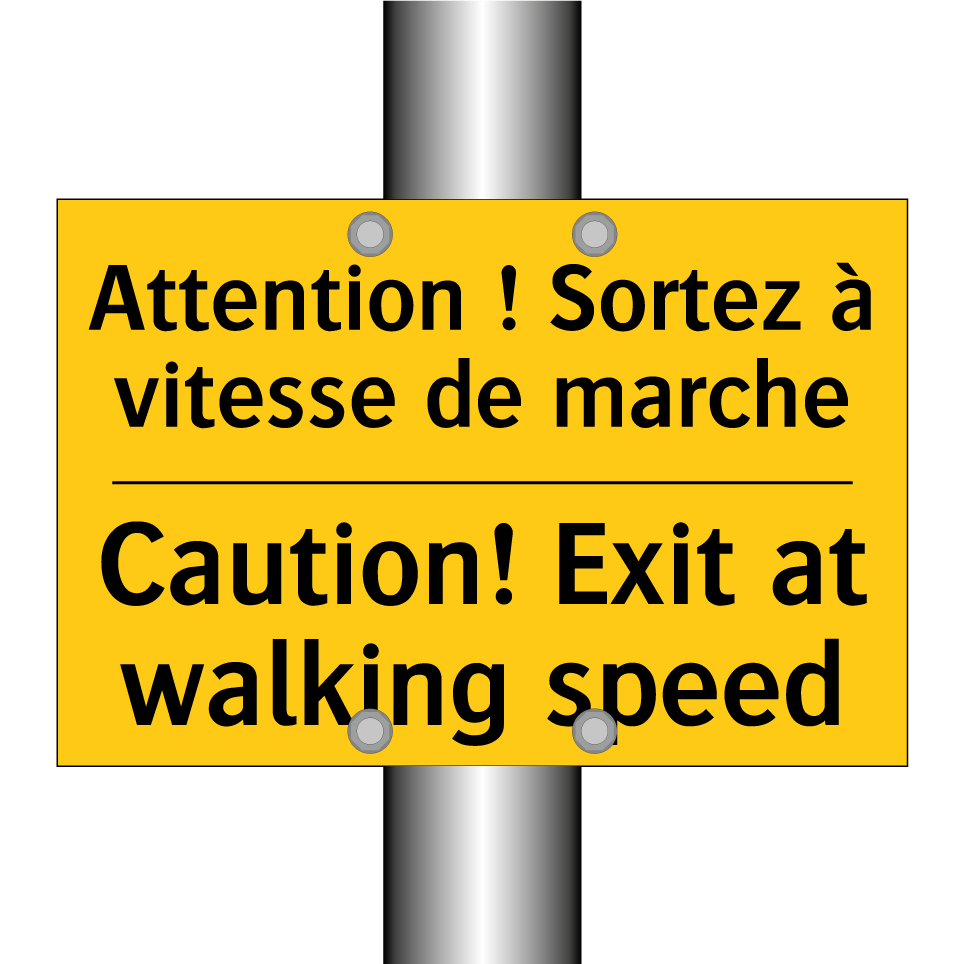 Panneau d'avertissement bilingue avec texte en français : "Attention ! Sortez à vitesse de marche", et en anglais : "Caution! Exit at walking speed"