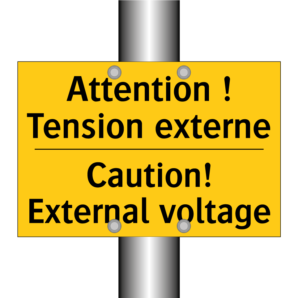 Panneau d'avertissement bilingue avec texte en français : "Attention ! Tension externe", et en anglais : "Caution! External voltage"