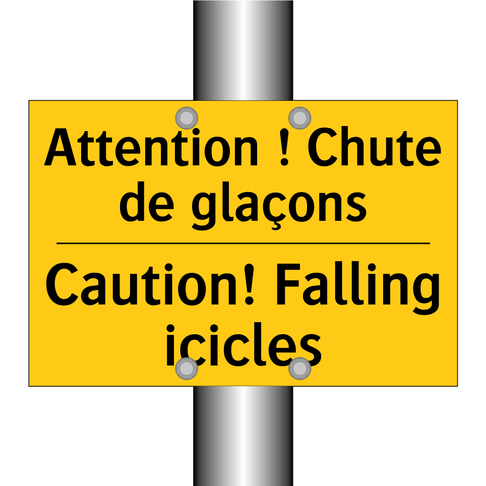 Panneau d'avertissement bilingue avec texte en français : "Attention ! Chute de glaçons", et en anglais : "Caution! Falling icicles"