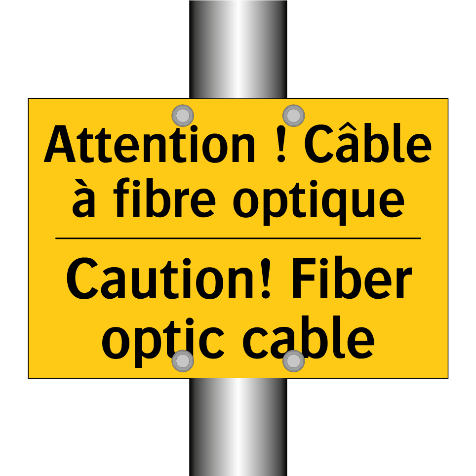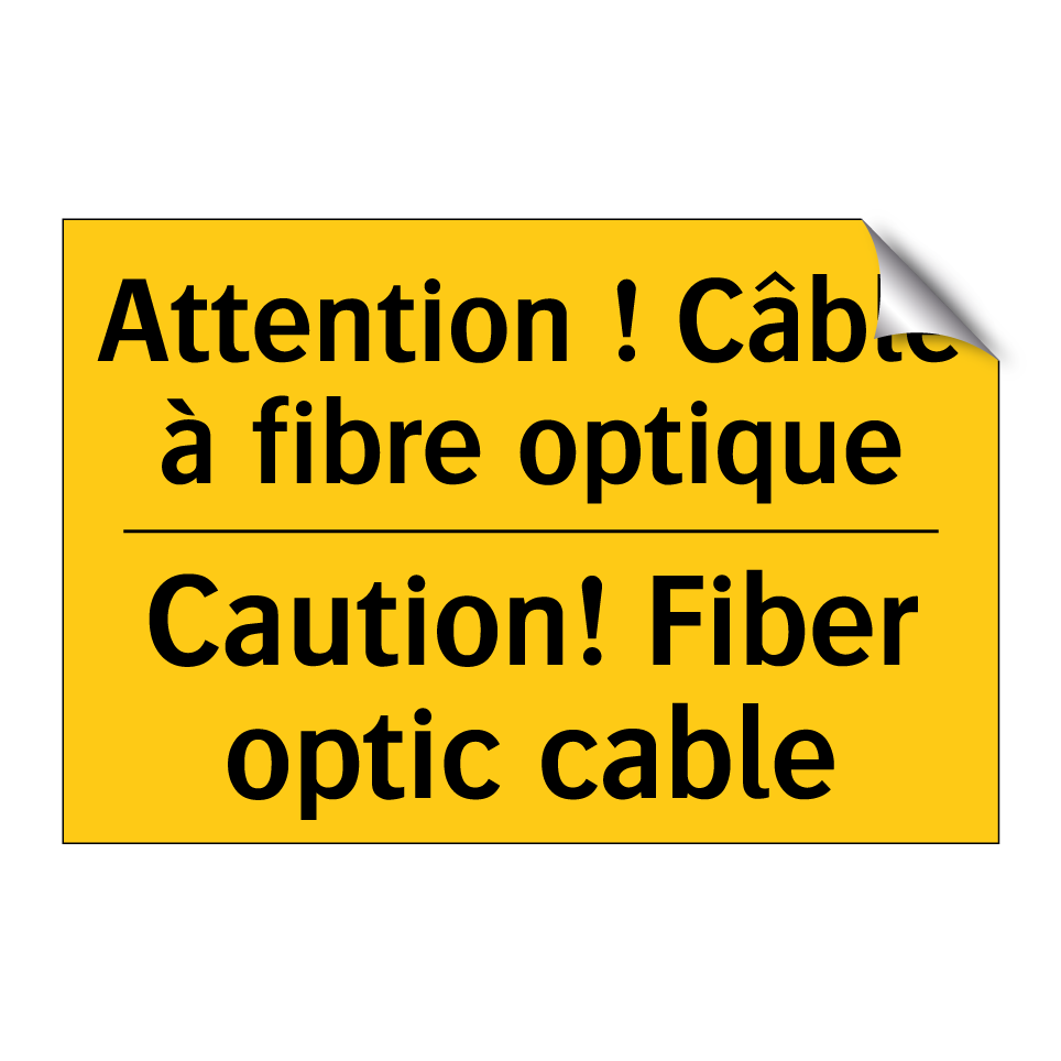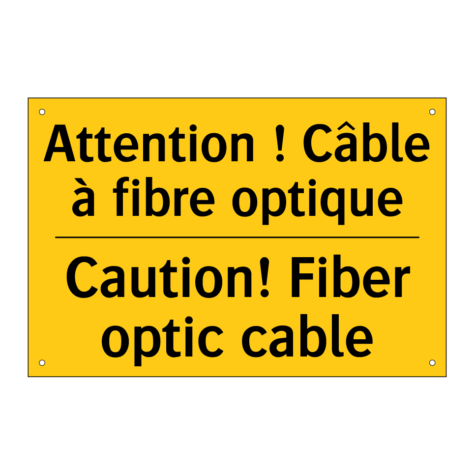 Panneau d'avertissement bilingue avec texte en français : "Attention ! Câble à fibre optique", et en anglais : "Caution! Fiber optic cable"