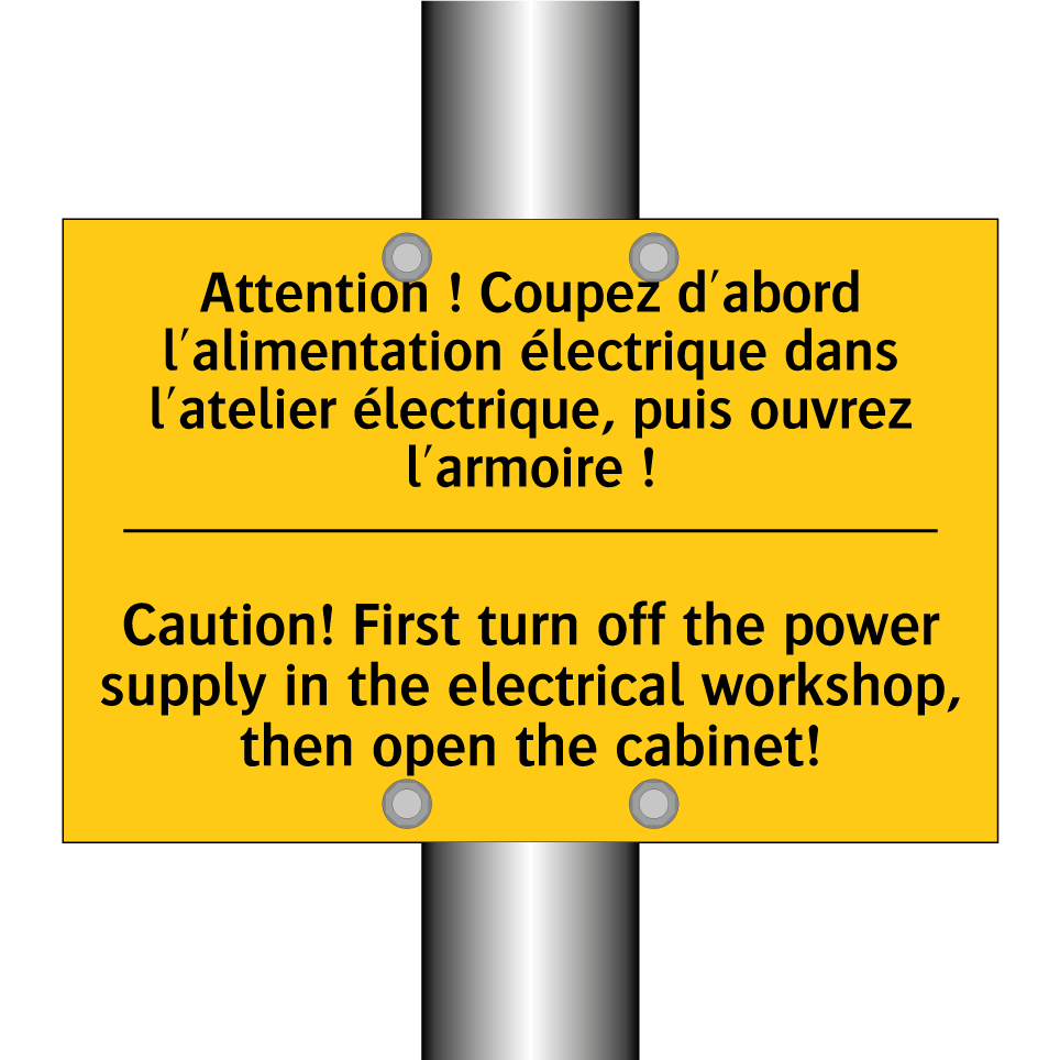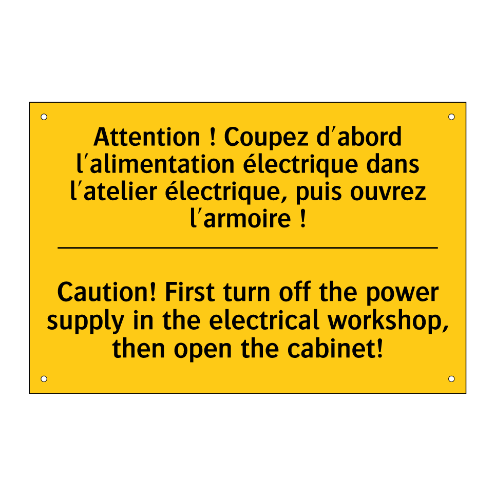 Panneau d'avertissement bilingue avec texte en français : "Attention ! Coupez d'abord l'alimentation électrique dans l'atelier électrique, puis ouvrez l'armoire !", et en anglais : "Caution! First turn off the power supply in the electrical workshop, then open the cabinet!"