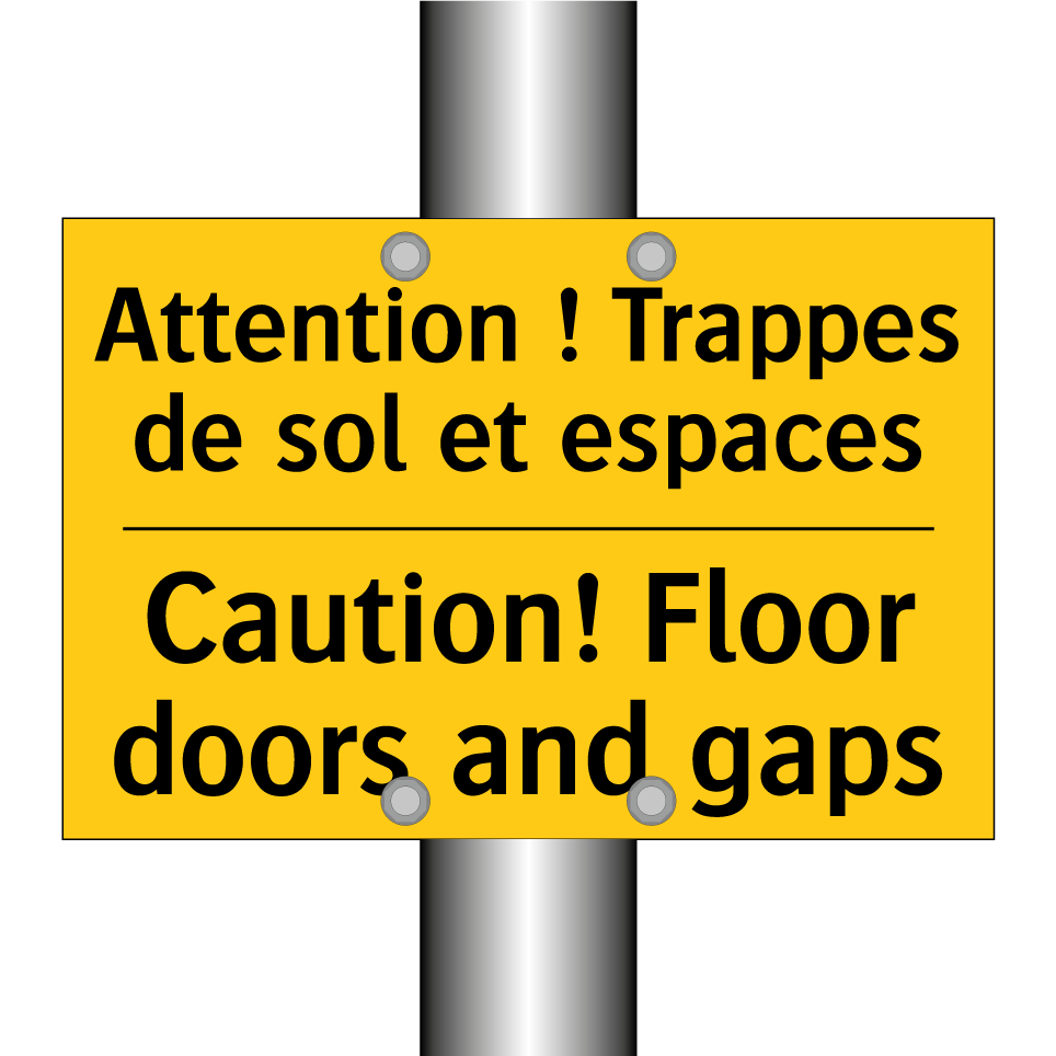 Panneau d'avertissement bilingue avec texte en français : "Attention ! Trappes de sol et espaces", et en anglais : "Caution! Floor doors and gaps"