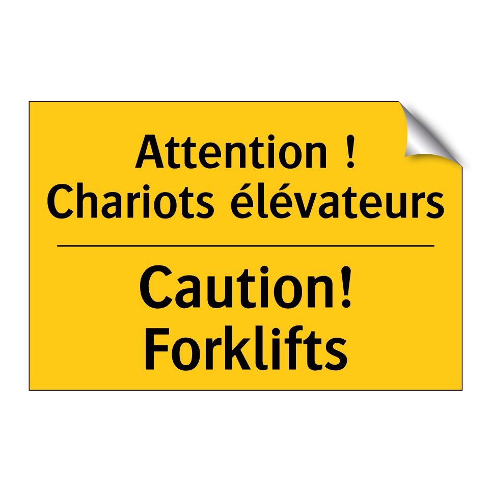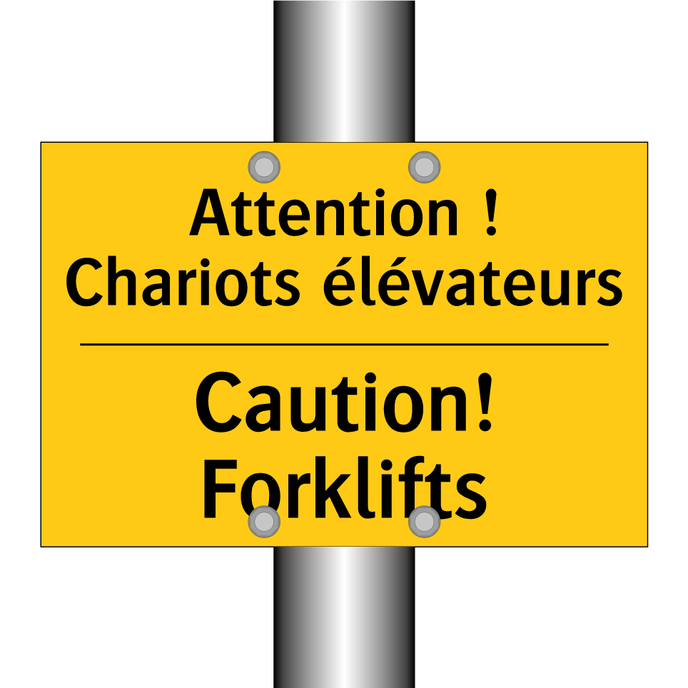 Panneau d'avertissement bilingue avec texte en français : "Attention ! Chariots élévateurs", et en anglais : "Caution! Forklifts"