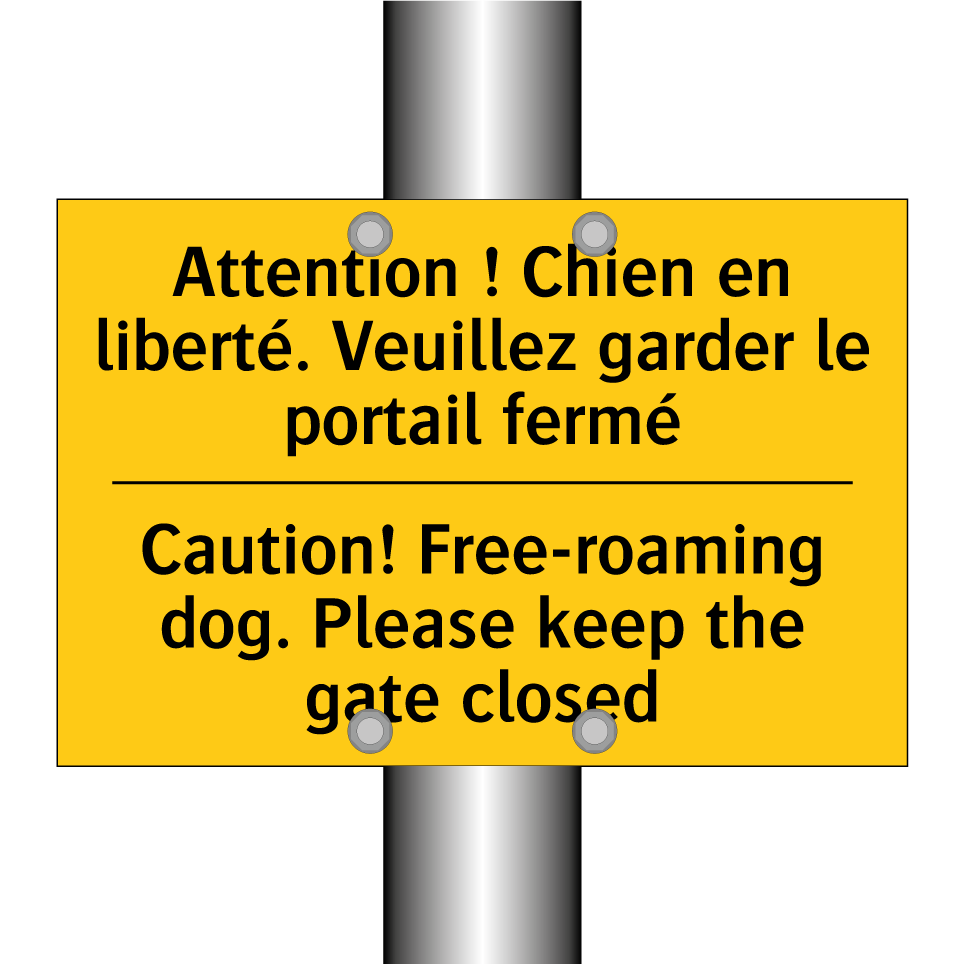 Panneau d'avertissement bilingue avec texte en français : "Attention ! Chien en liberté. Veuillez garder le portail fermé", et en anglais : "Caution! Free-roaming dog. Please keep the gate closed"