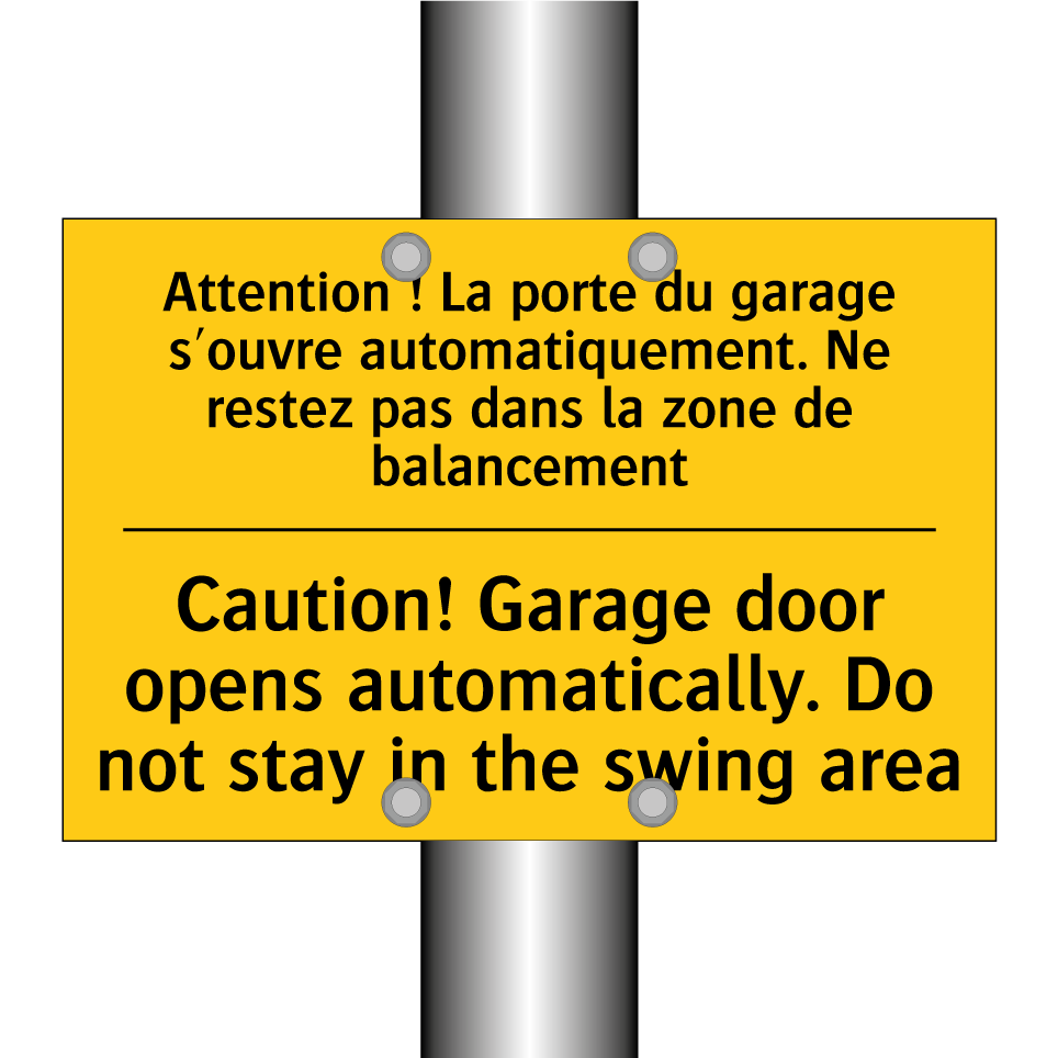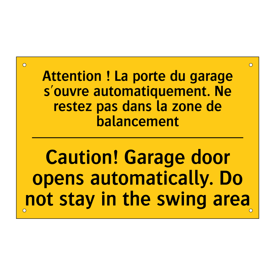 Panneau d'avertissement bilingue avec texte en français : "Attention ! La porte du garage s'ouvre automatiquement. Ne restez pas dans la zone de balancement", et en anglais : "Caution! Garage door opens automatically. Do not stay in the swing area"