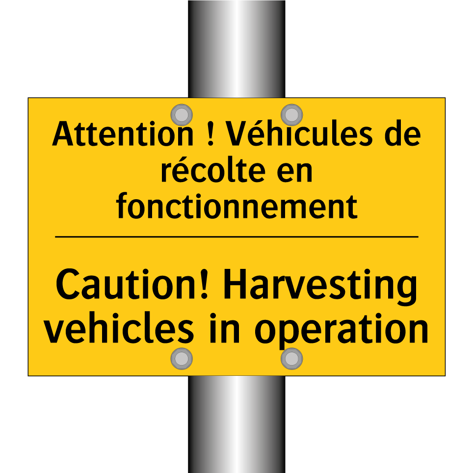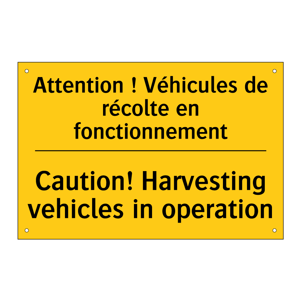 Panneau d'avertissement bilingue avec texte en français : "Attention ! Véhicules de récolte en fonctionnement", et en anglais : "Caution! Harvesting vehicles in operation"