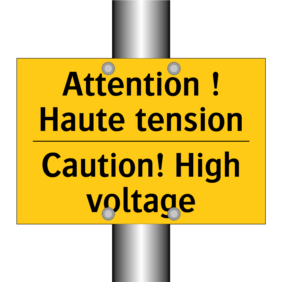 Panneau d'avertissement bilingue avec texte en français : "Attention ! Haute tension", et en anglais : "Caution! High voltage"