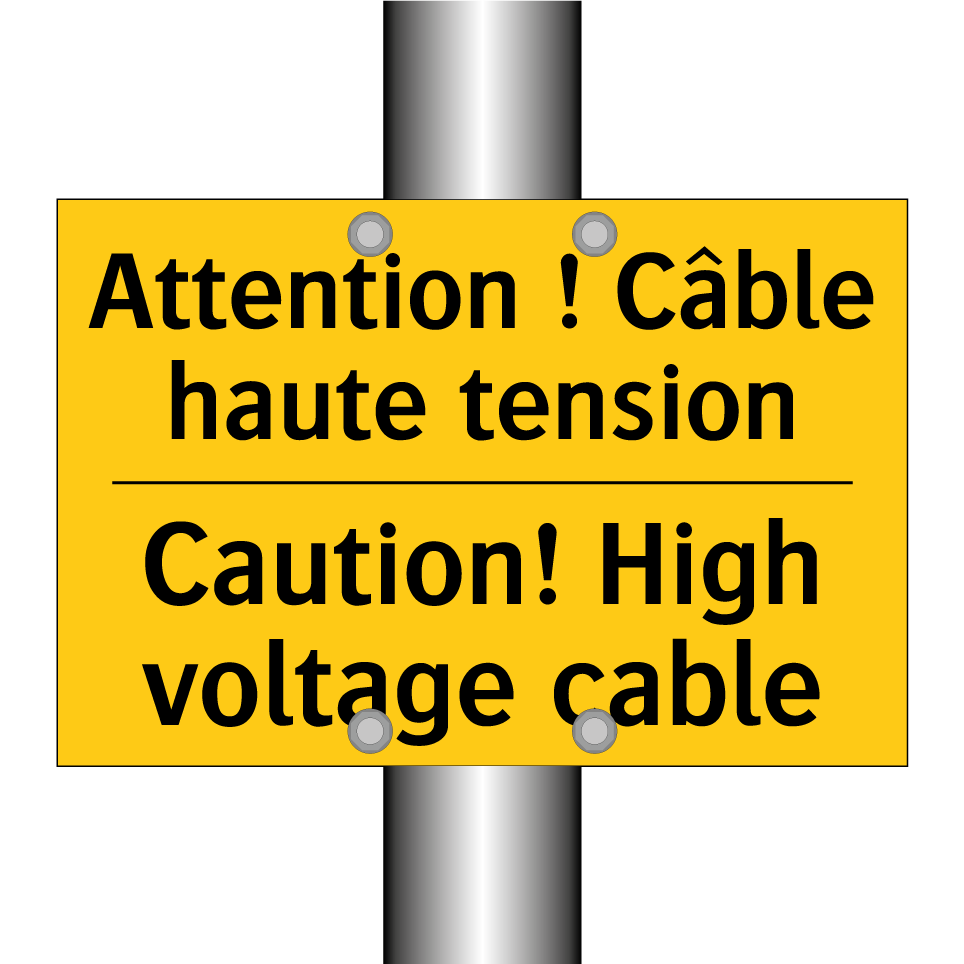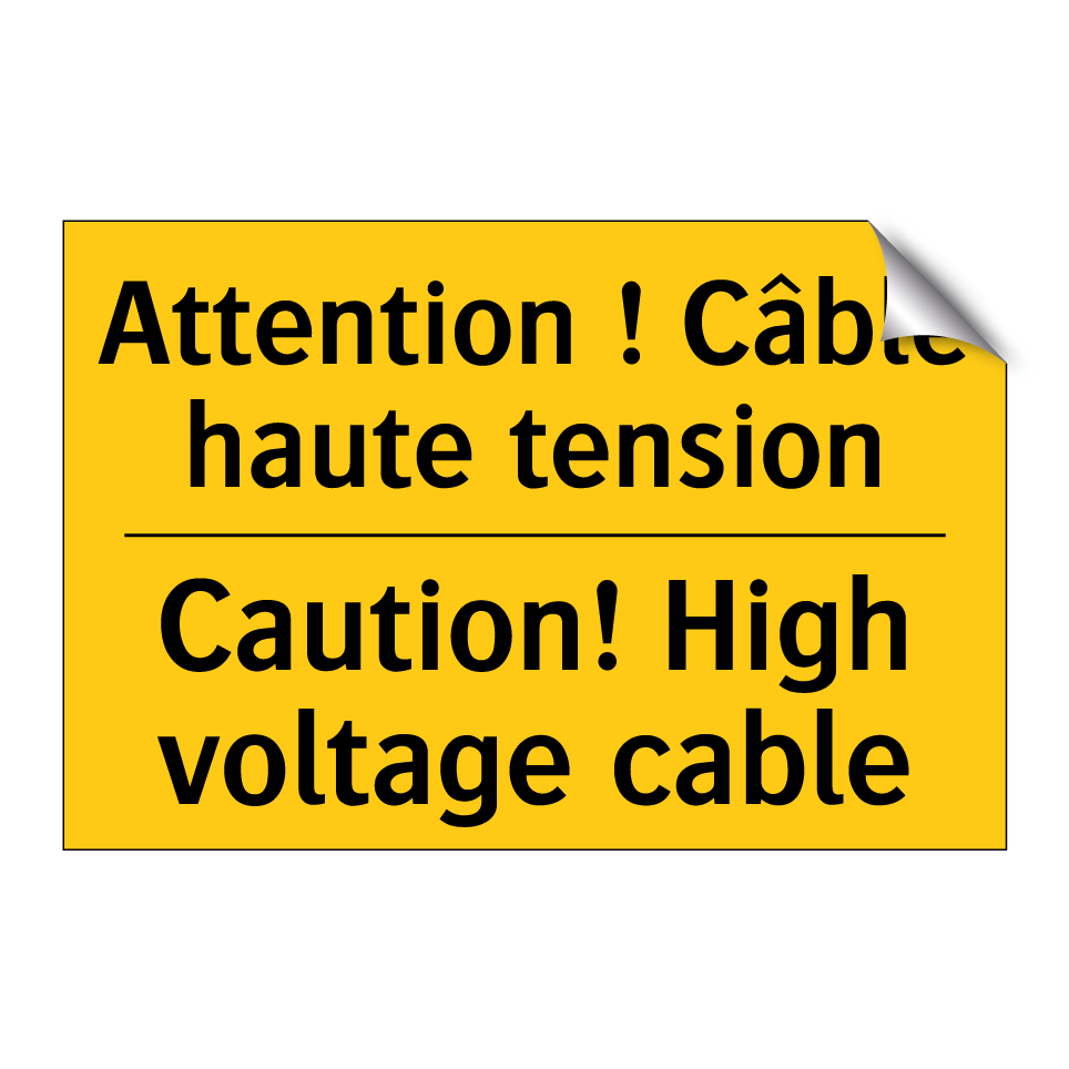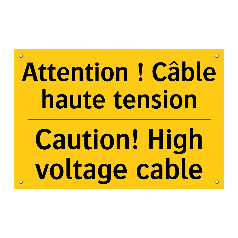 Panneau d'avertissement bilingue avec texte en français : "Attention ! Câble haute tension", et en anglais : "Caution! High voltage cable"