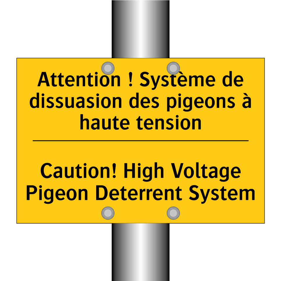 Panneau d'avertissement bilingue avec texte en français : "Attention ! Système de dissuasion des pigeons à haute tension", et en anglais : "Caution! High Voltage Pigeon Deterrent System"