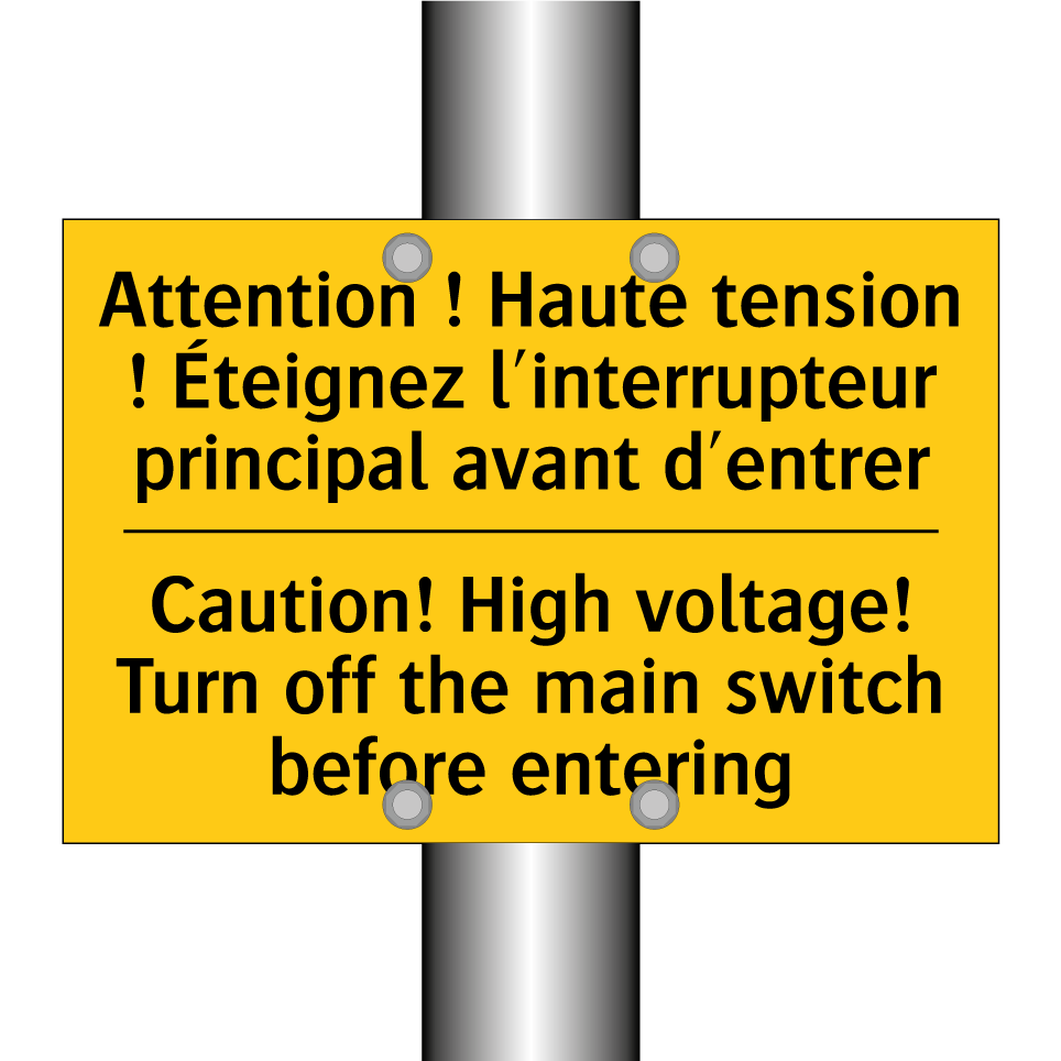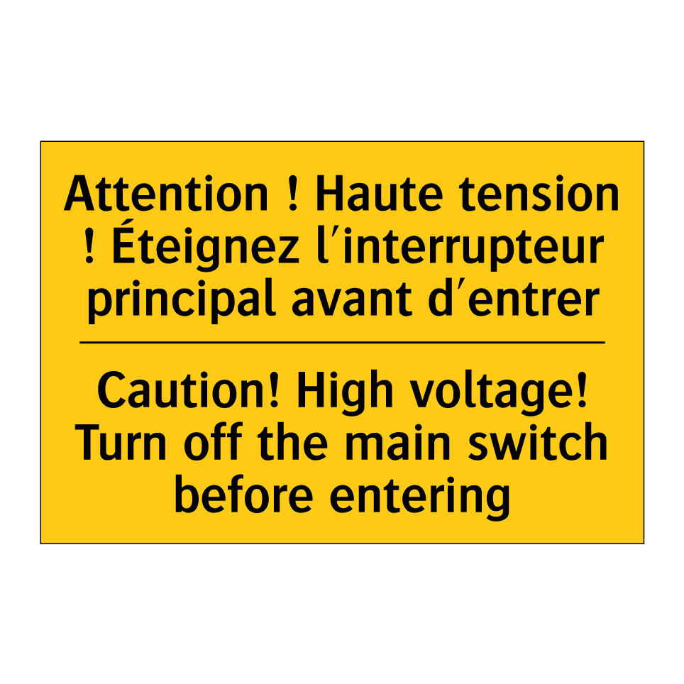 Panneau d'avertissement bilingue avec texte en français : "Attention ! Haute tension ! Éteignez l'interrupteur principal avant d'entrer", et en anglais : "Caution! High voltage! Turn off the main switch before entering"