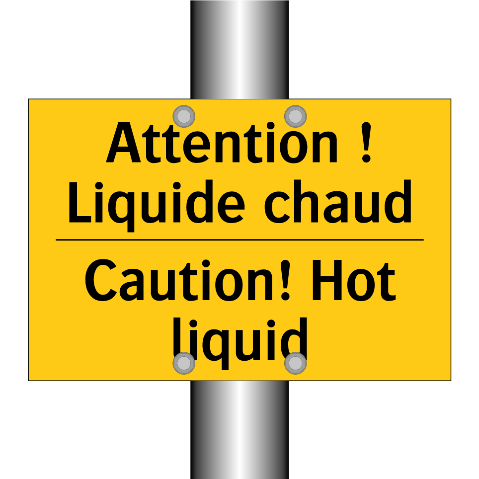 Panneau d'avertissement bilingue avec texte en français : "Attention ! Liquide chaud", et en anglais : "Caution! Hot liquid"