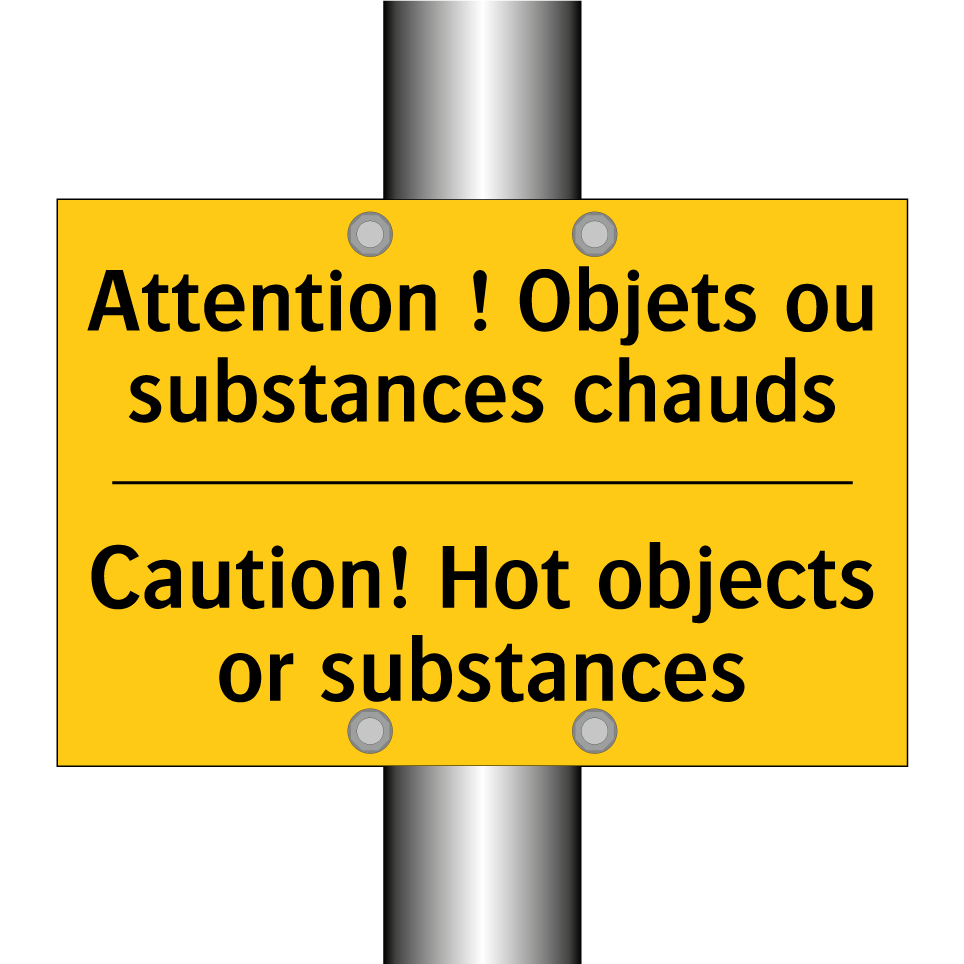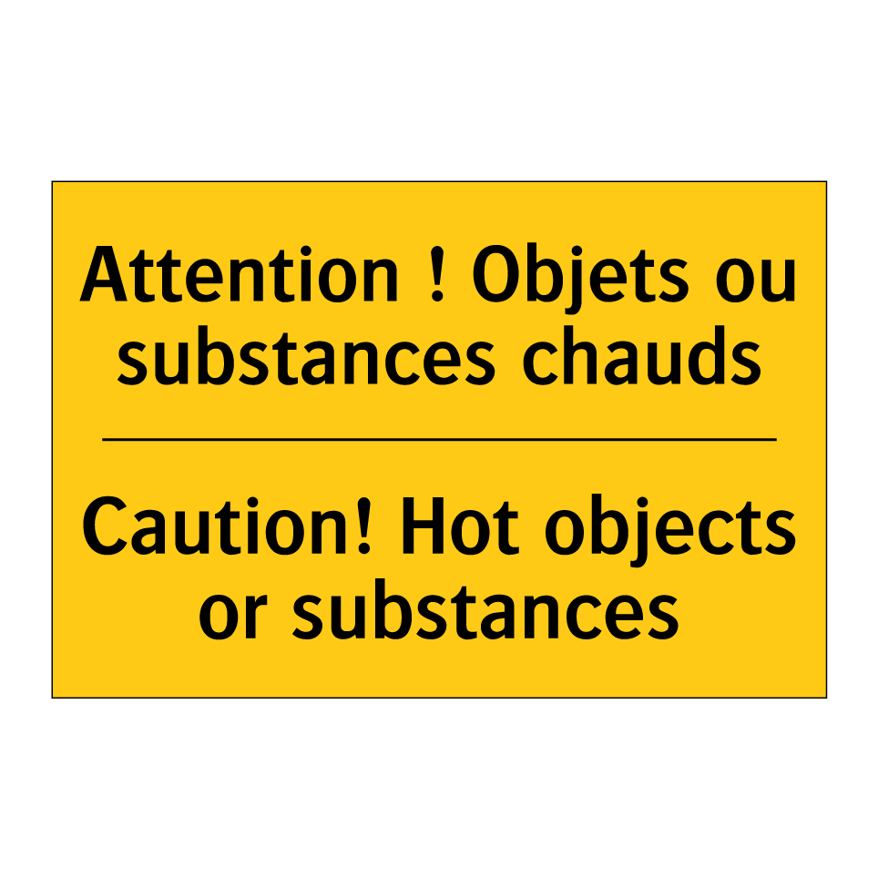 Panneau d'avertissement bilingue avec texte en français : "Attention ! Objets ou substances chauds", et en anglais : "Caution! Hot objects or substances"