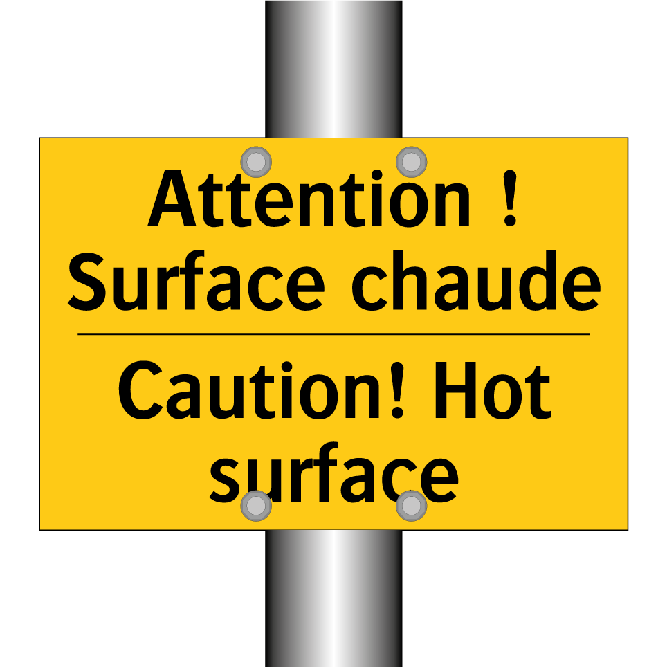Panneau d'avertissement bilingue avec texte en français : "Attention ! Surface chaude", et en anglais : "Caution! Hot surface"