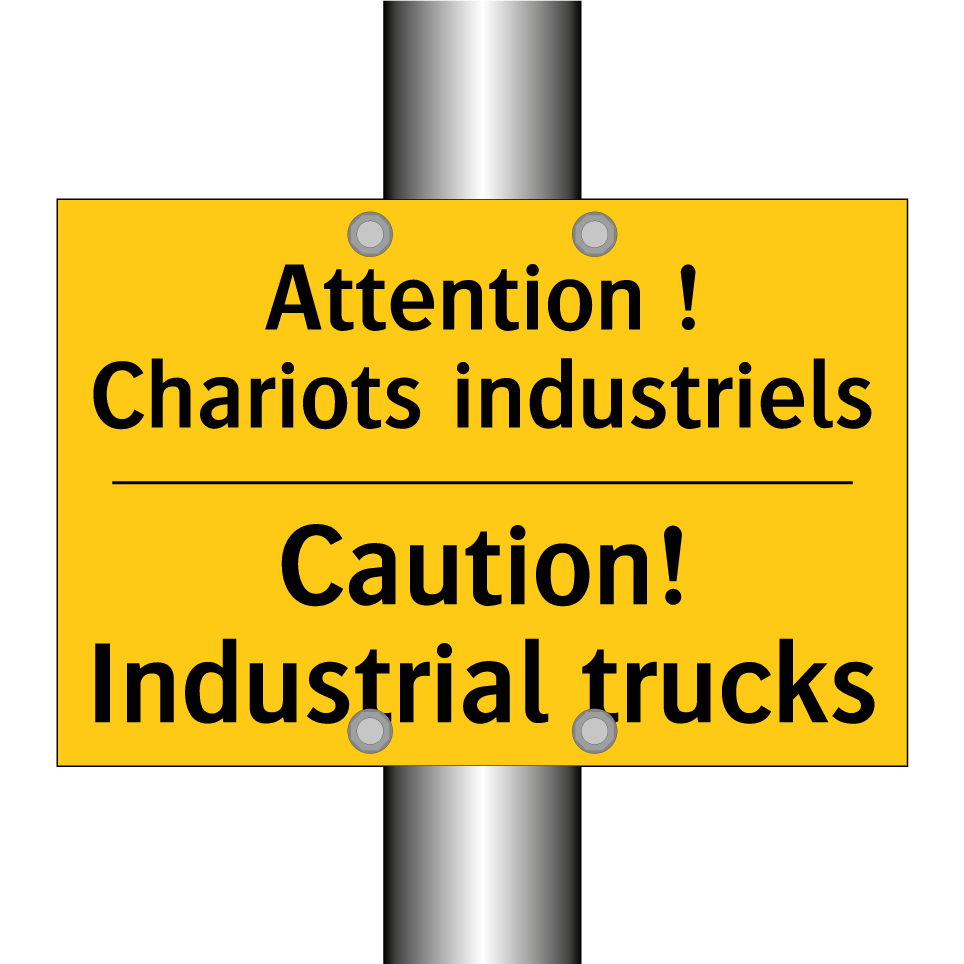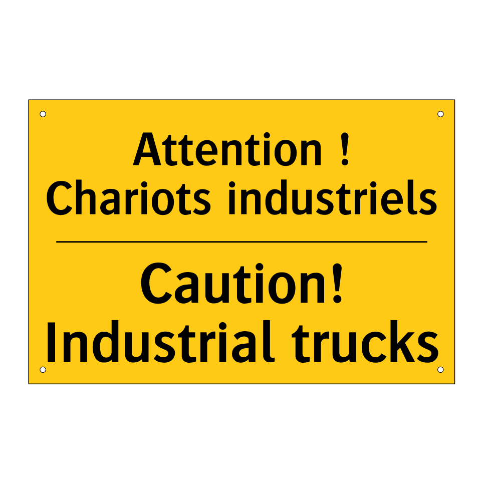 Panneau d'avertissement bilingue avec texte en français : "Attention ! Chariots industriels", et en anglais : "Caution! Industrial trucks"