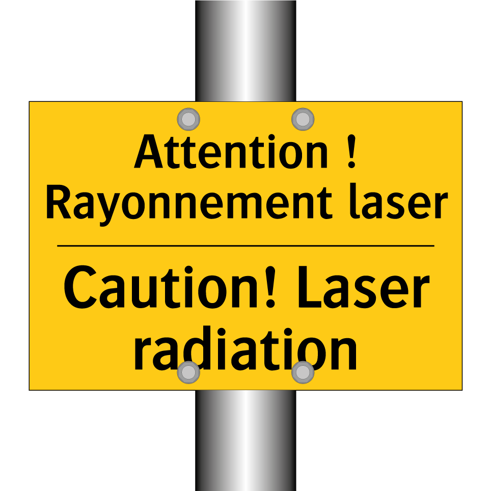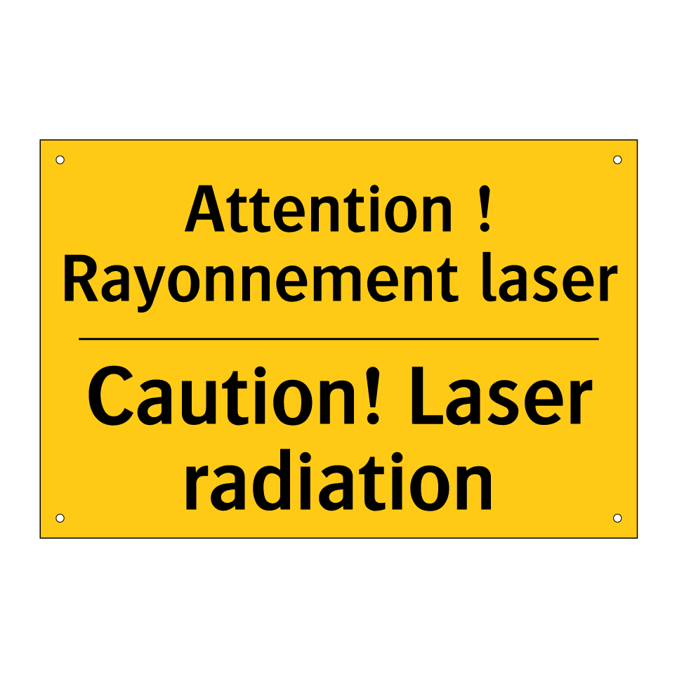 Panneau d'avertissement bilingue avec texte en français : "Attention ! Rayonnement laser", et en anglais : "Caution! Laser radiation"