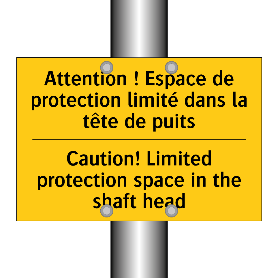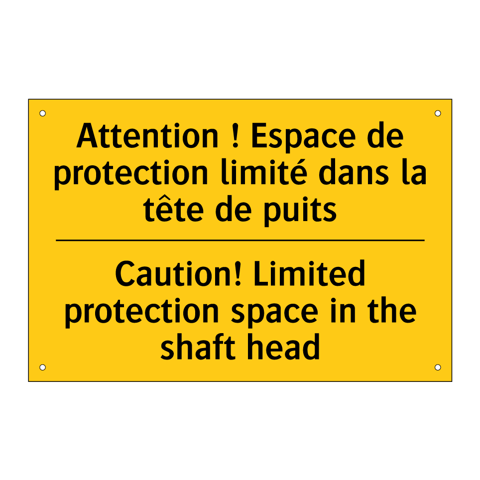 Panneau d'avertissement bilingue avec texte en français : "Attention ! Espace de protection limité dans la tête de puits", et en anglais : "Caution! Limited protection space in the shaft head"