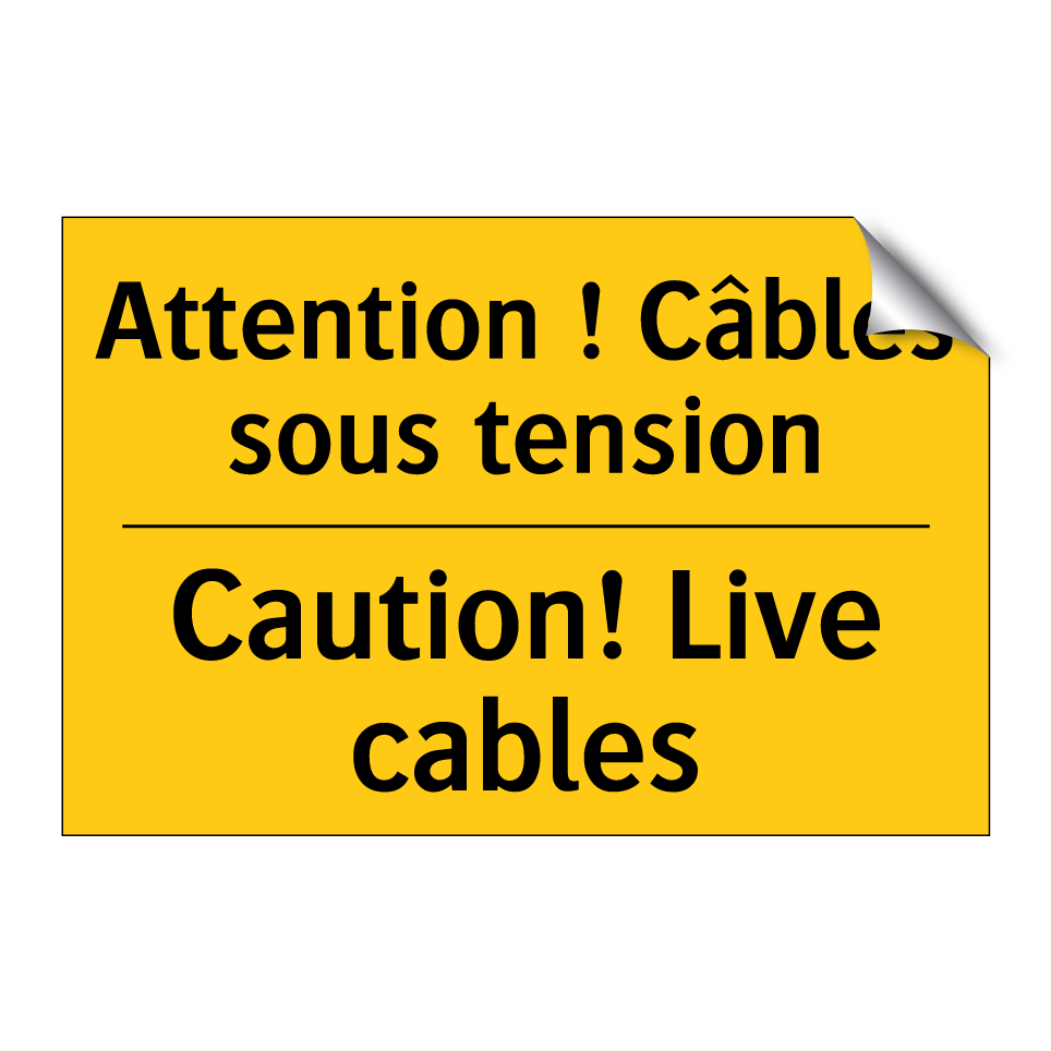 Panneau d'avertissement bilingue avec texte en français : "Attention ! Câbles sous tension", et en anglais : "Caution! Live cables"