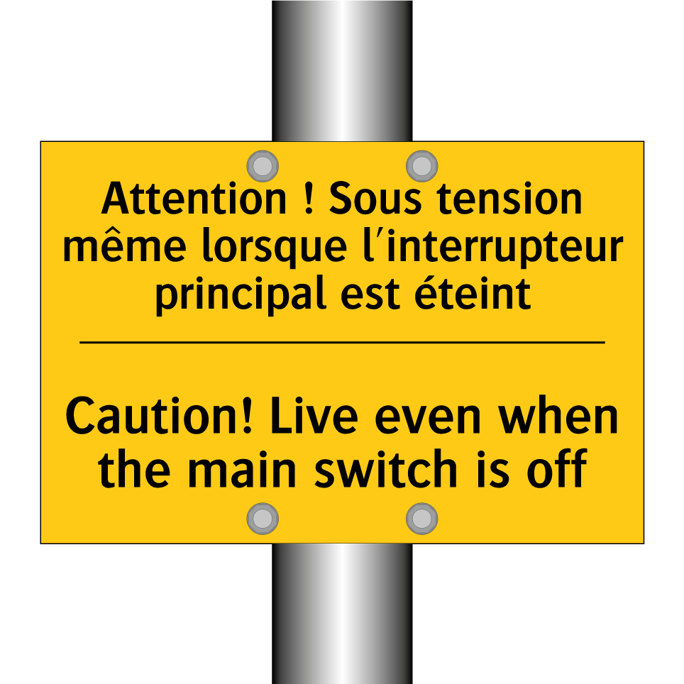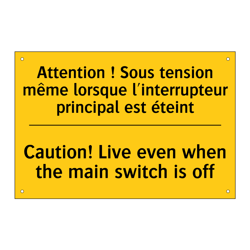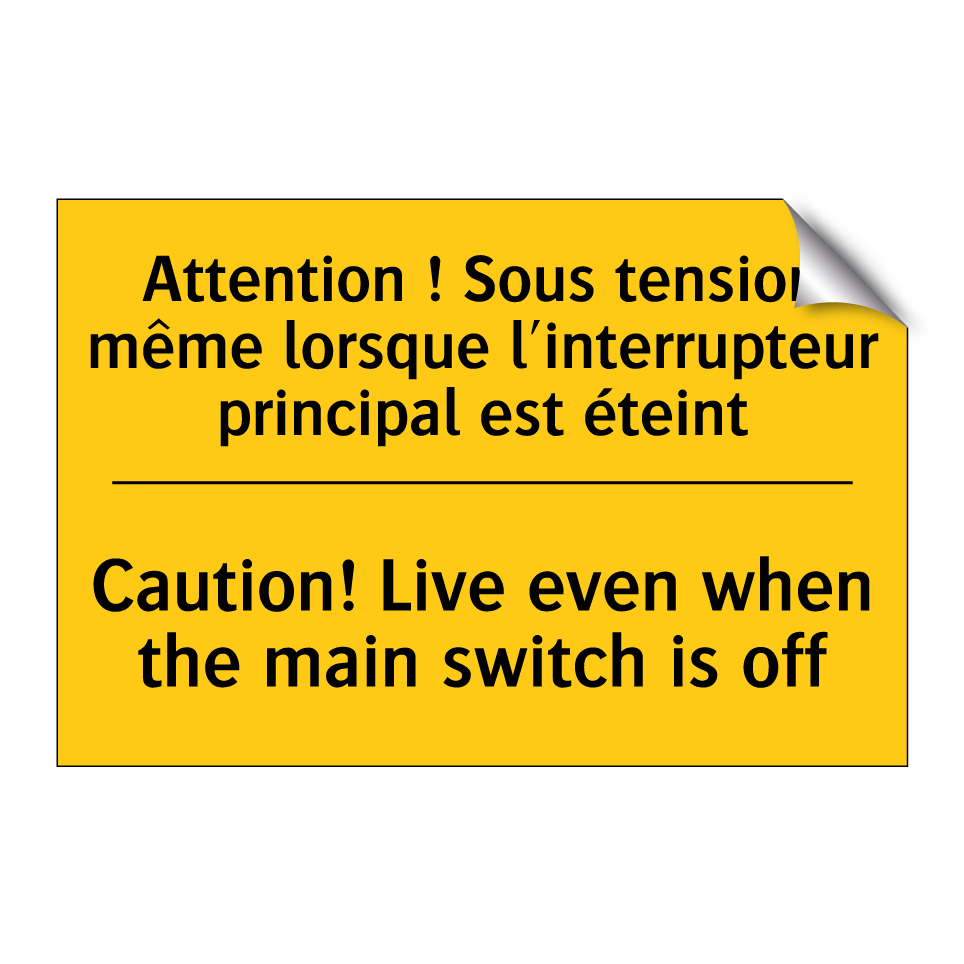 Panneau d'avertissement bilingue avec texte en français : "Attention ! Sous tension même lorsque l'interrupteur principal est éteint", et en anglais : "Caution! Live even when the main switch is off"