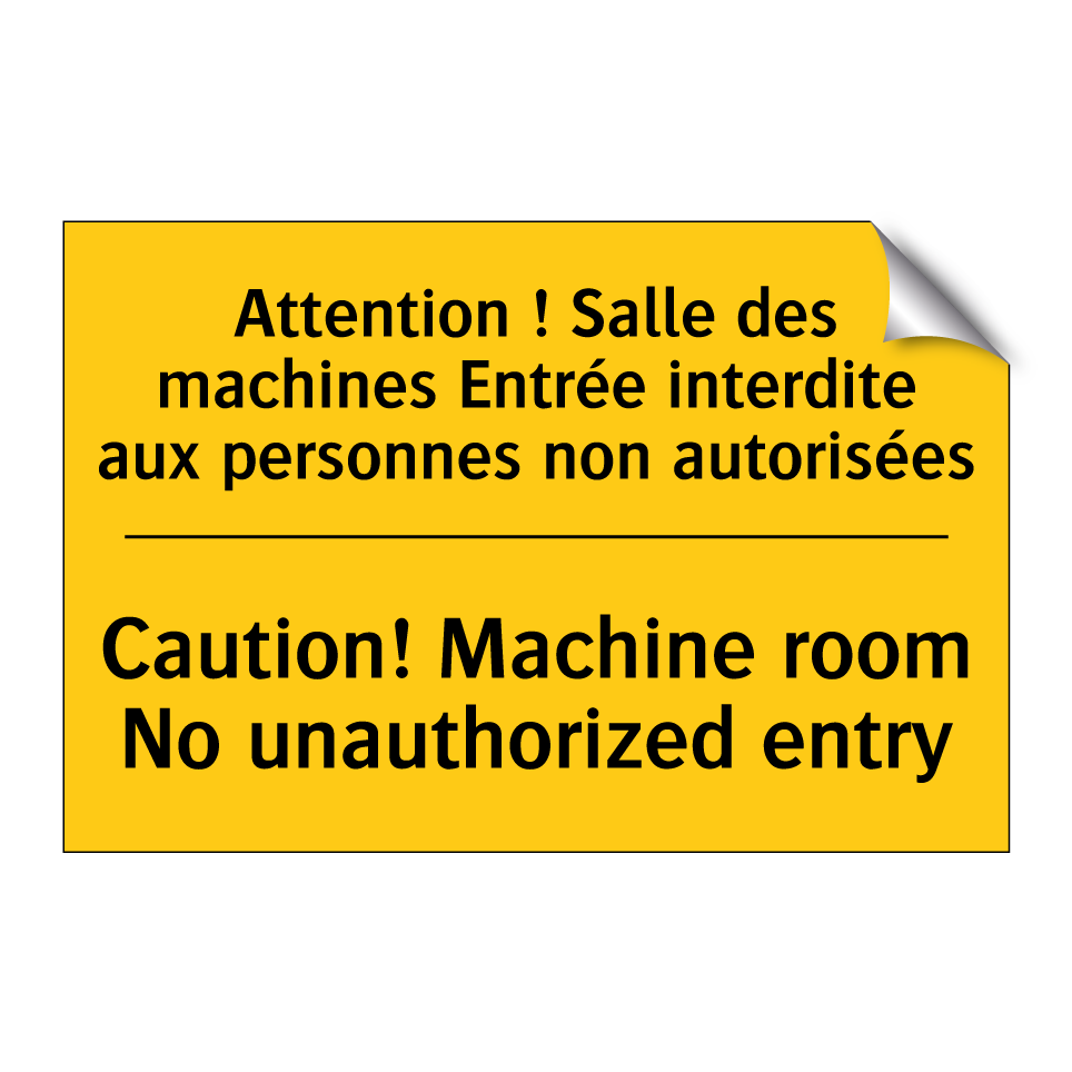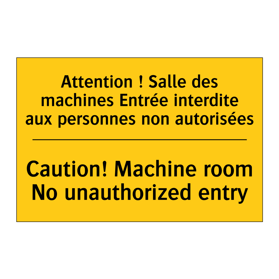 Panneau d'avertissement bilingue avec texte en français : "Attention ! Salle des machines Entrée interdite aux personnes non autorisées", et en anglais : "Caution! Machine room No unauthorized entry"
