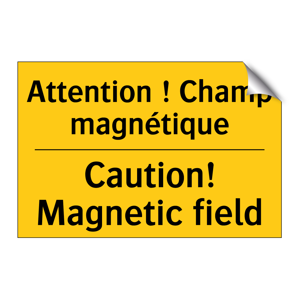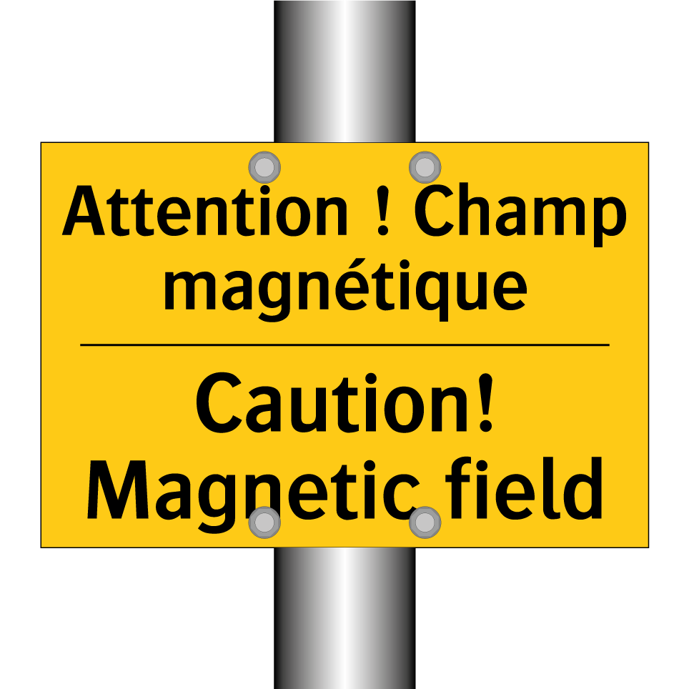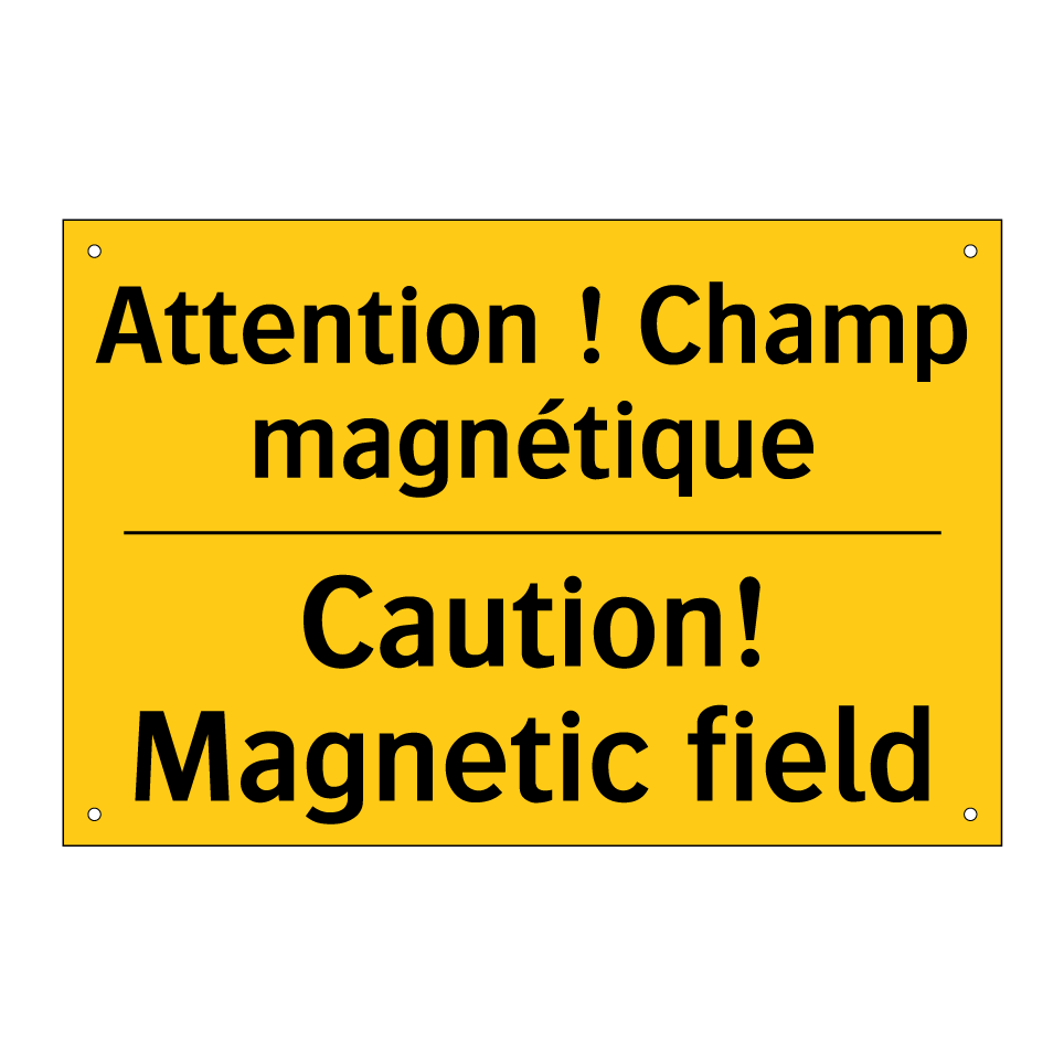 Panneau d'avertissement bilingue avec texte en français : "Attention ! Champ magnétique", et en anglais : "Caution! Magnetic field"