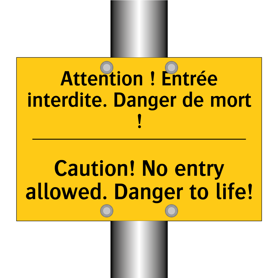 Panneau d'avertissement bilingue avec texte en français : "Attention ! Entrée interdite. Danger de mort !", et en anglais : "Caution! No entry allowed. Danger to life!"