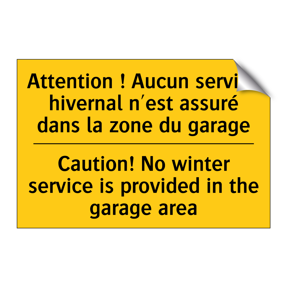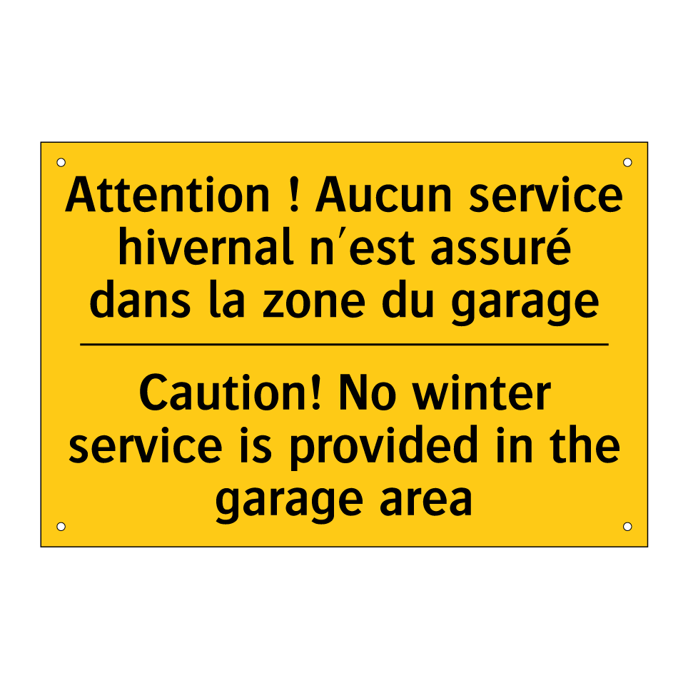 Panneau d'avertissement bilingue avec texte en français : "Attention ! Aucun service hivernal n'est assuré dans la zone du garage", et en anglais : "Caution! No winter service is provided in the garage area"
