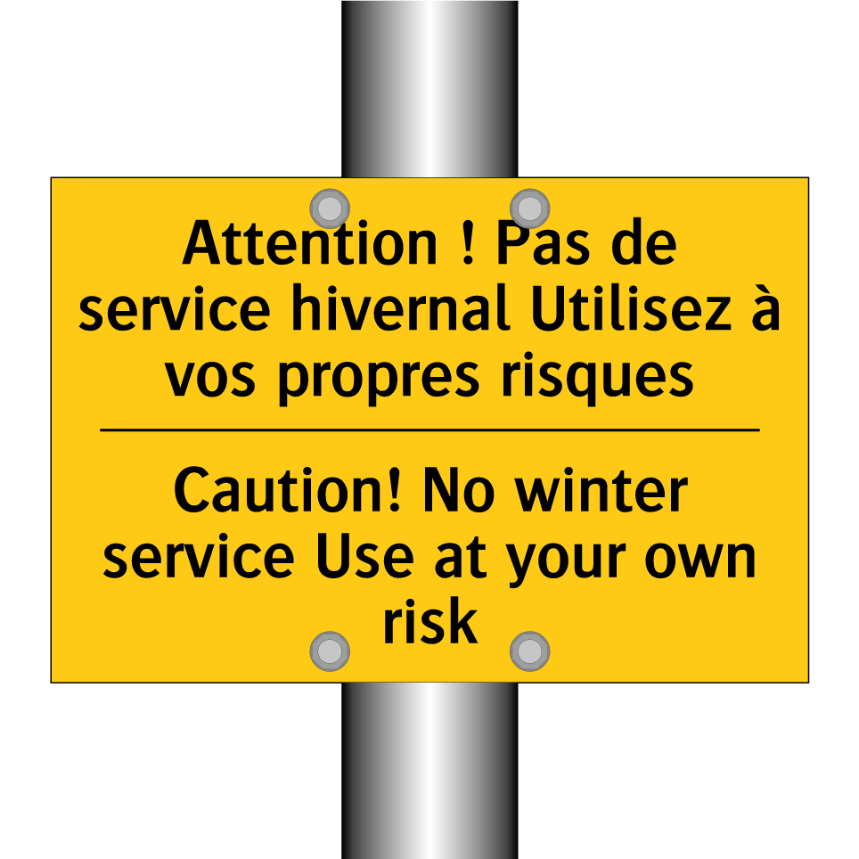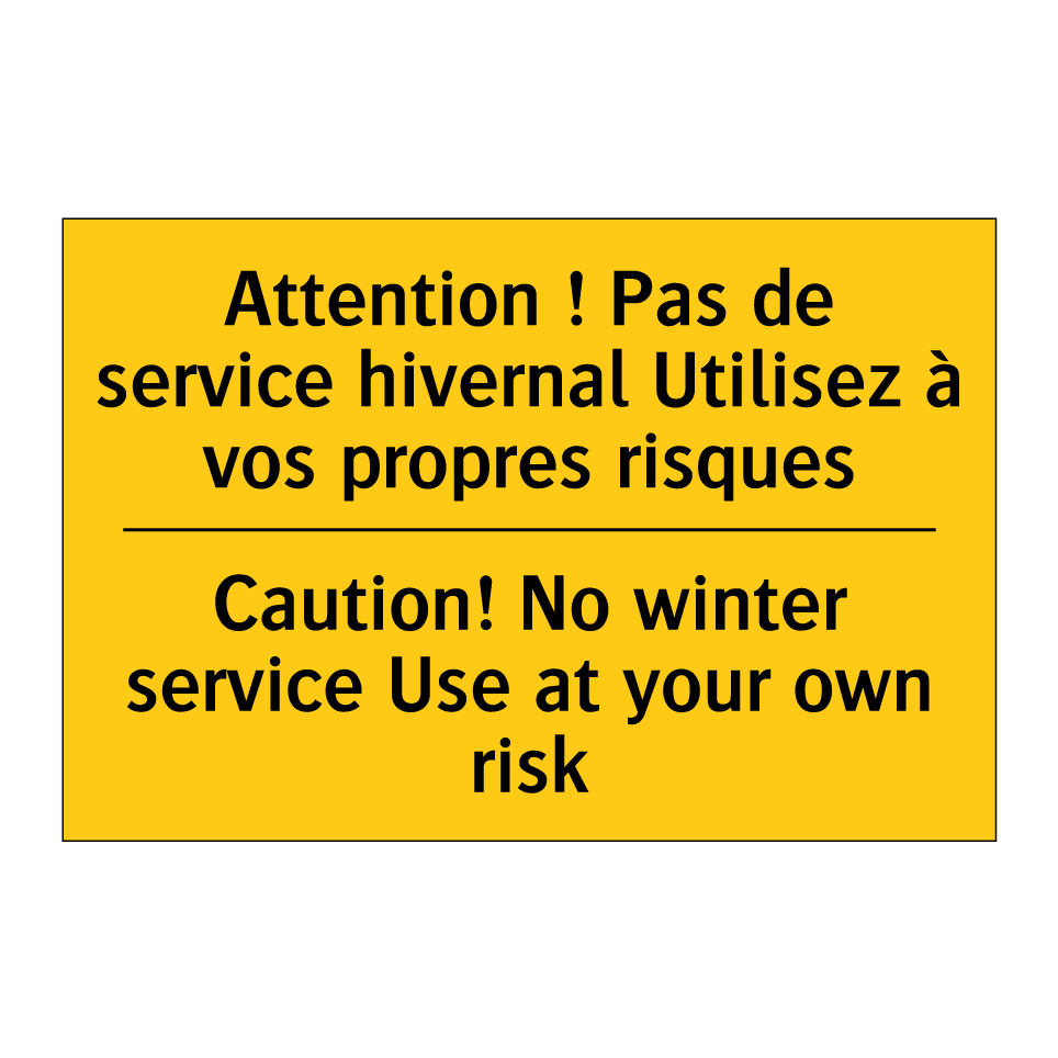 Panneau d'avertissement bilingue avec texte en français : "Attention ! Pas de service hivernal Utilisez à vos propres risques", et en anglais : "Caution! No winter service Use at your own risk"
