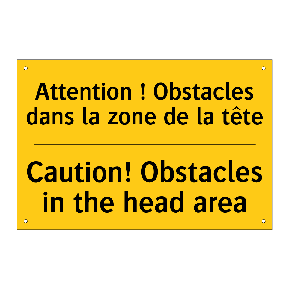 Panneau d'avertissement bilingue avec texte en français : "Attention ! Obstacles dans la zone de la tête", et en anglais : "Caution! Obstacles in the head area"