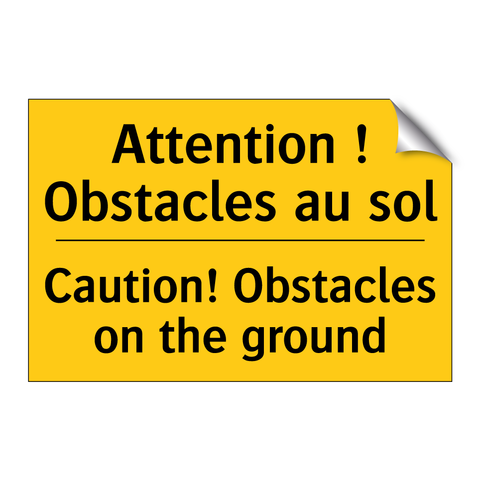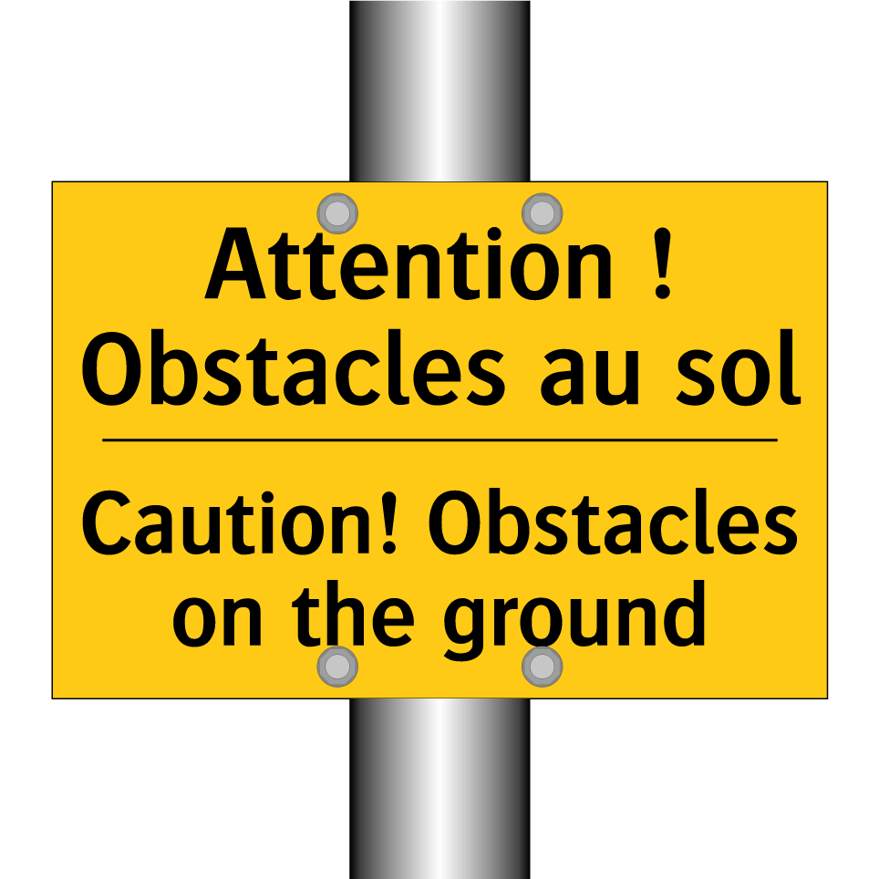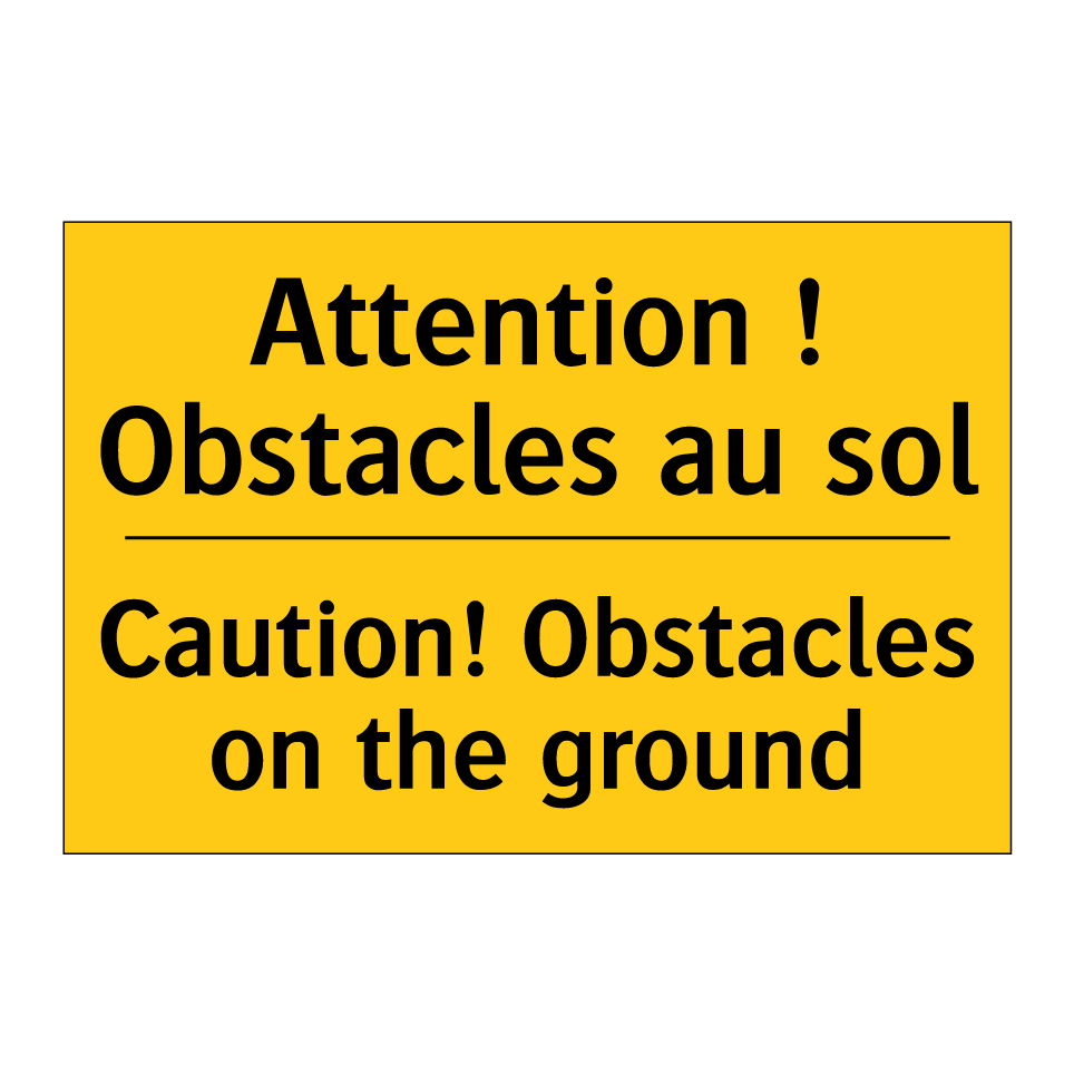 Panneau d'avertissement bilingue avec texte en français : "Attention ! Obstacles au sol", et en anglais : "Caution! Obstacles on the ground"