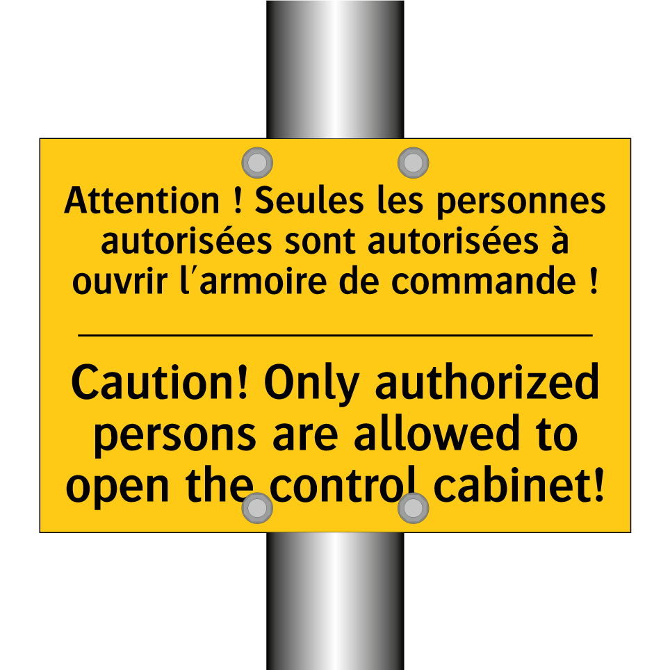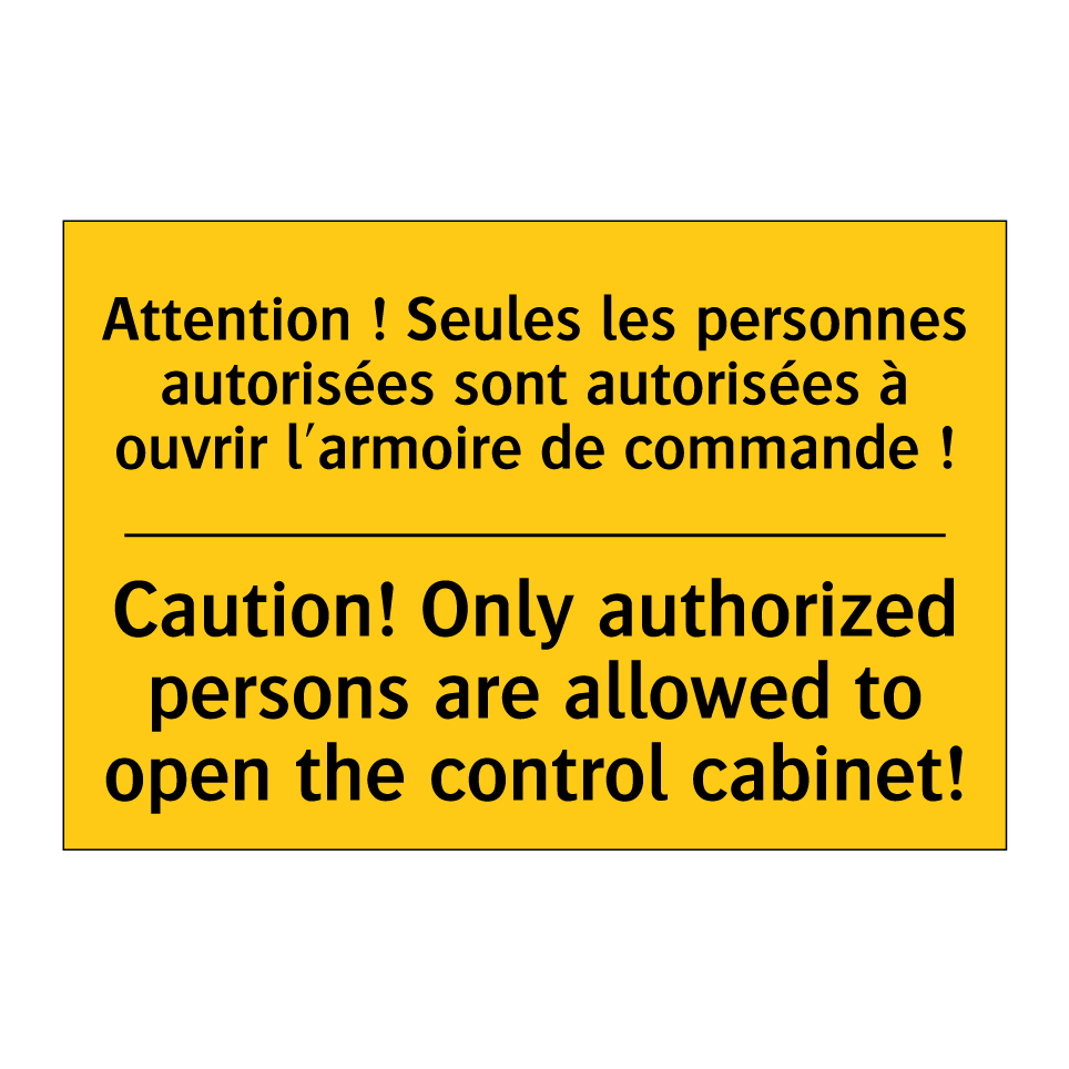 Panneau d'avertissement bilingue avec texte en français : "Attention ! Seules les personnes autorisées sont autorisées à ouvrir l'armoire de commande !", et en anglais : "Caution! Only authorized persons are allowed to open the control cabinet!"