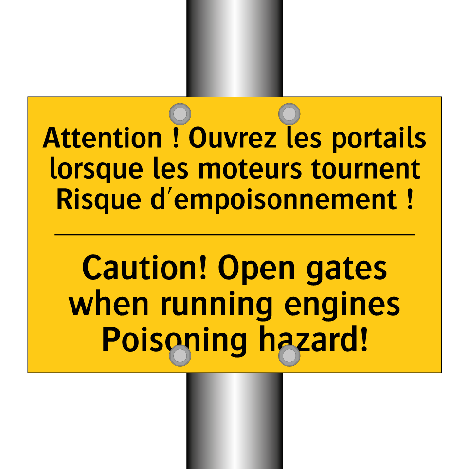 Panneau d'avertissement bilingue avec texte en français : "Attention ! Ouvrez les portails lorsque les moteurs tournent Risque d'empoisonnement !", et en anglais : "Caution! Open gates when running engines Poisoning hazard!"