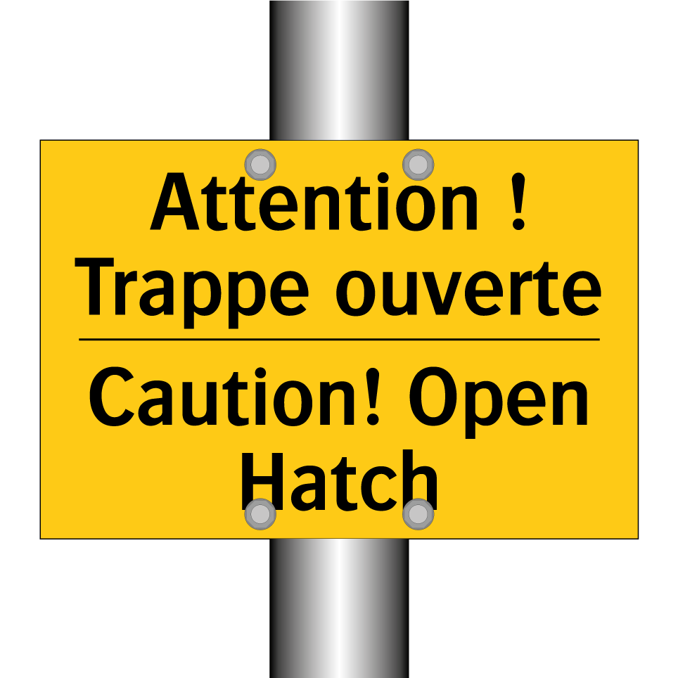 Panneau d'avertissement bilingue avec texte en français : "Attention ! Trappe ouverte", et en anglais : "Caution! Open Hatch"