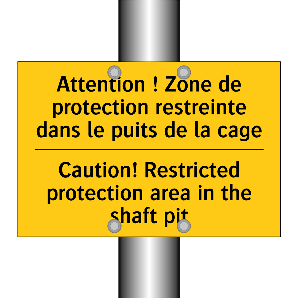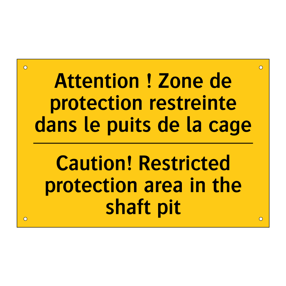 Panneau d'avertissement bilingue avec texte en français : "Attention ! Zone de protection restreinte dans le puits de la cage", et en anglais : "Caution! Restricted protection area in the shaft pit"