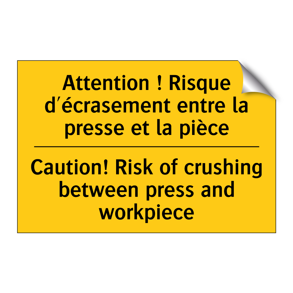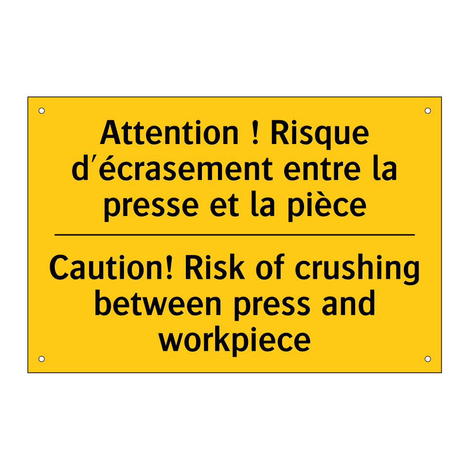 Panneau d'avertissement bilingue avec texte en français : "Attention ! Risque d'écrasement entre la presse et la pièce", et en anglais : "Caution! Risk of crushing between press and workpiece"