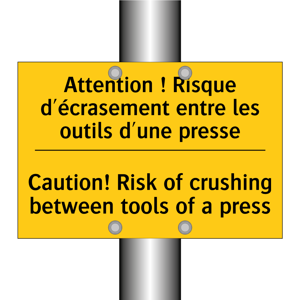 Panneau d'avertissement bilingue avec texte en français : "Attention ! Risque d'écrasement entre les outils d'une presse", et en anglais : "Caution! Risk of crushing between tools of a press"