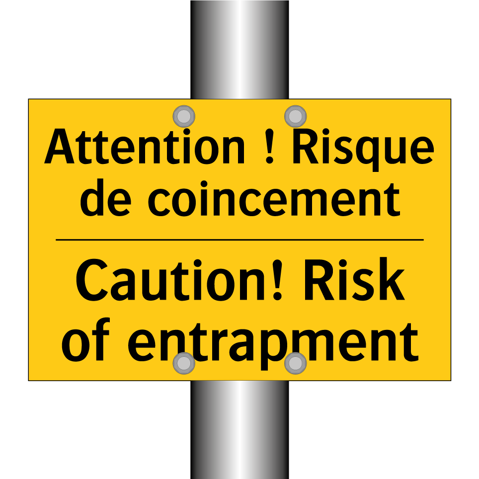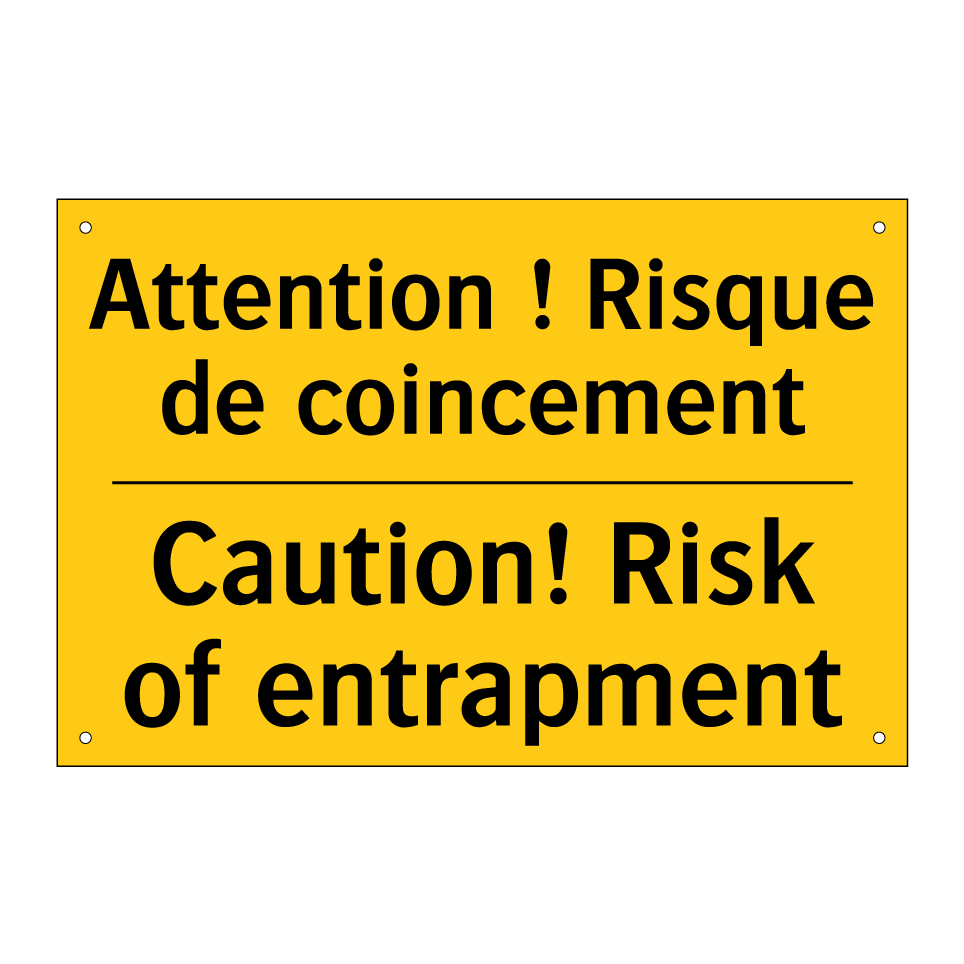Panneau d'avertissement bilingue avec texte en français : "Attention ! Risque de coincement", et en anglais : "Caution! Risk of entrapment"