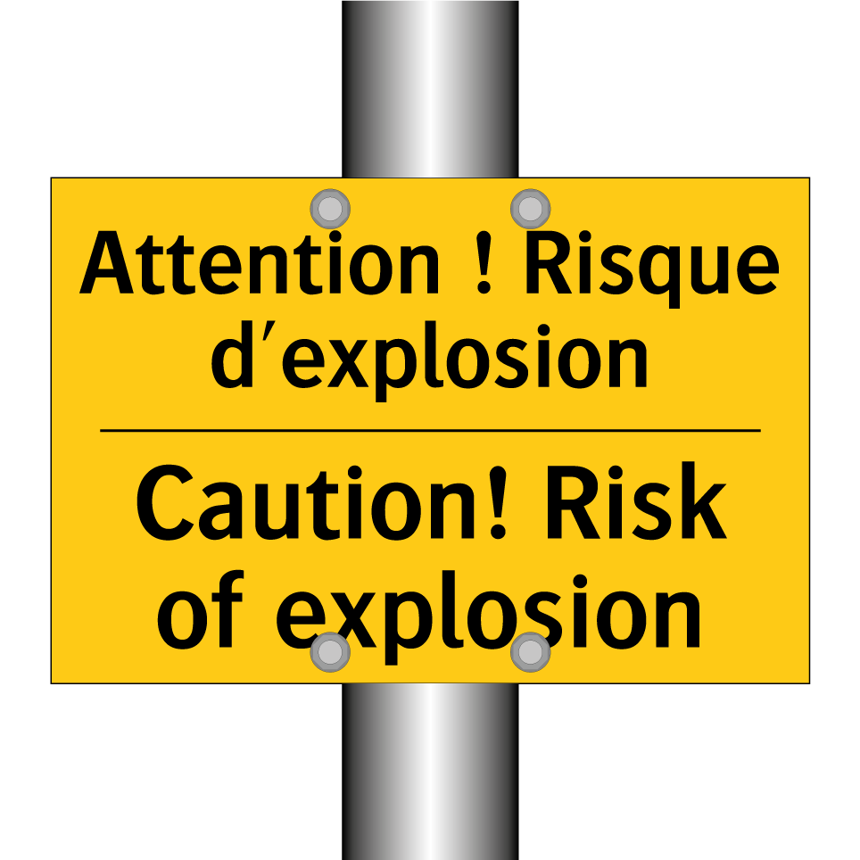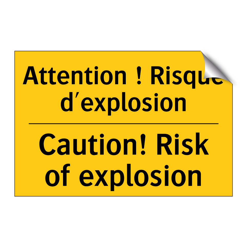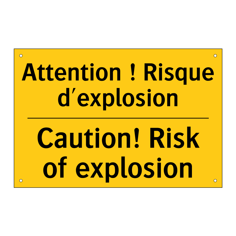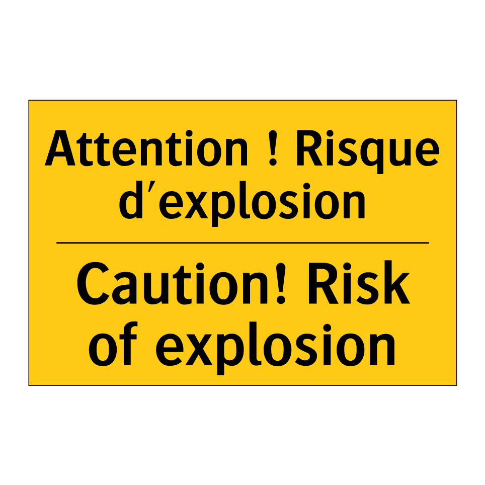 Panneau d'avertissement bilingue avec texte en français : "Attention ! Risque d'explosion", et en anglais : "Caution! Risk of explosion"