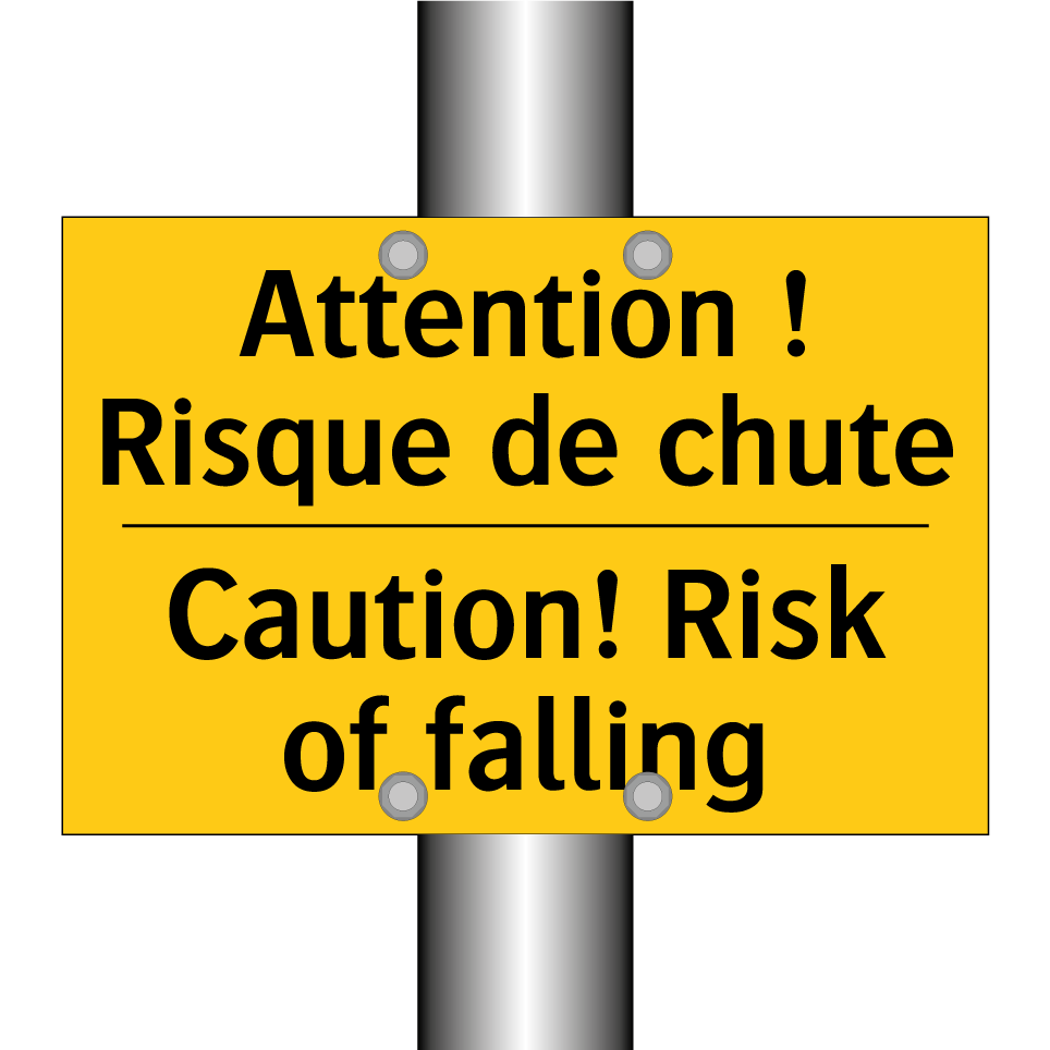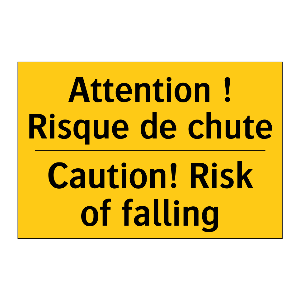 Panneau d'avertissement bilingue avec texte en français : "Attention ! Risque de chute", et en anglais : "Caution! Risk of falling"