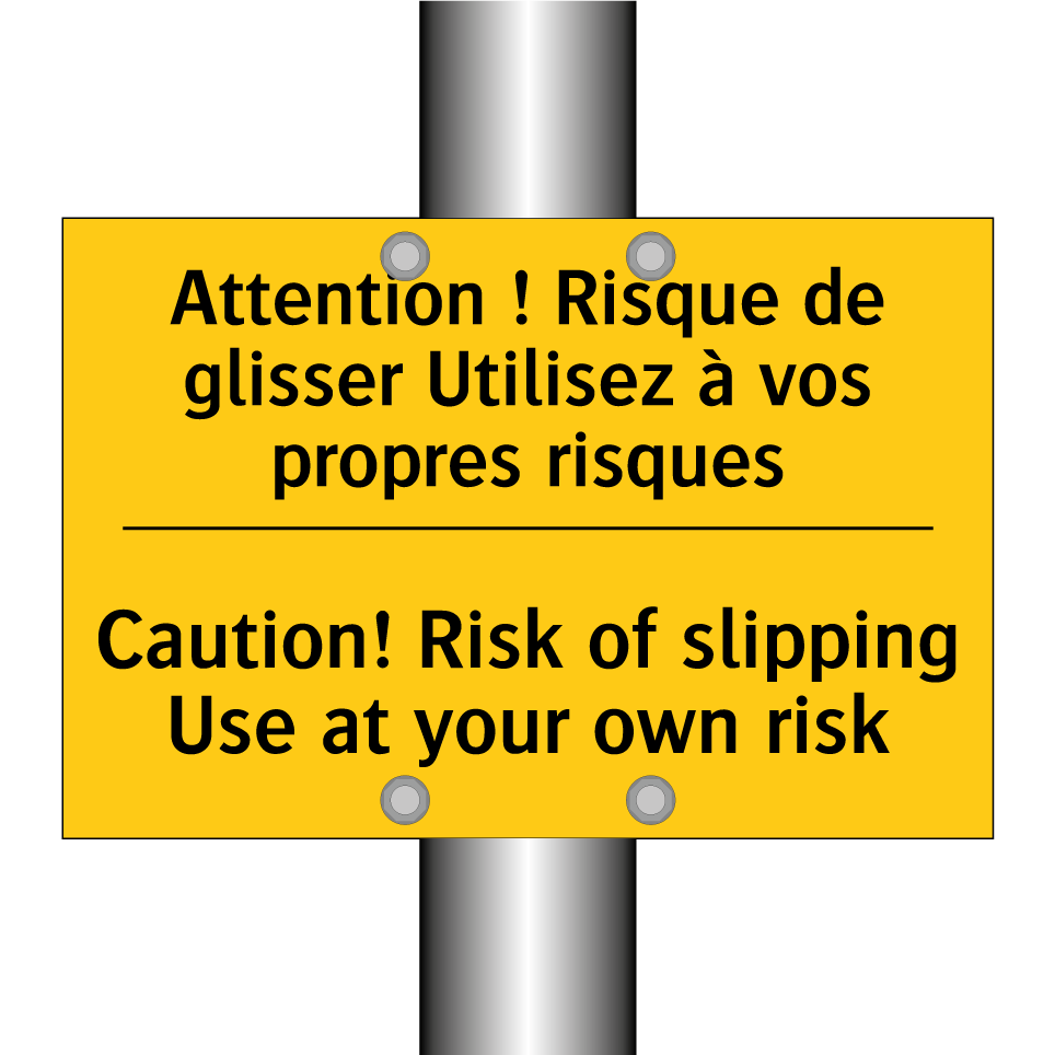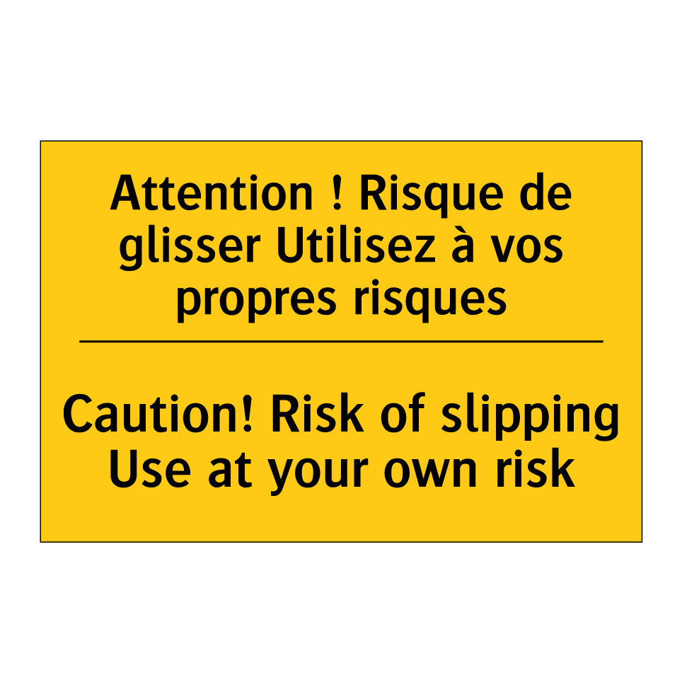 Panneau d'avertissement bilingue avec texte en français : "Attention ! Risque de glisser Utilisez à vos propres risques", et en anglais : "Caution! Risk of slipping Use at your own risk"